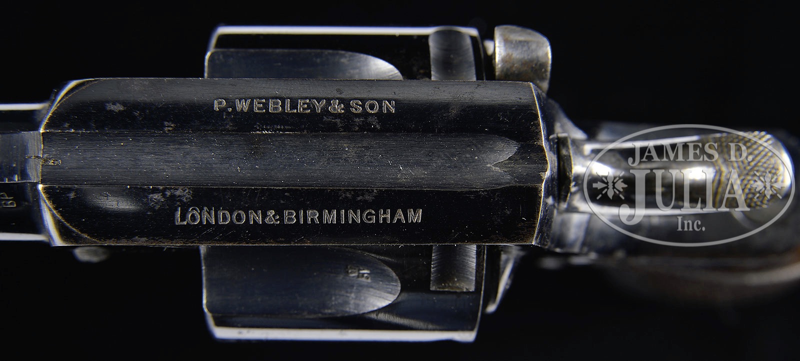 OUTSTANDING WEBLEY & SCOTT R.I.C. REVOLVER IN ORIG MANUFACTURER CARTON, .450.SN 101708. Cal .450. Standard production Webley & Scott R.I.C. 2-1/2″ bbl, having a fixed front and rear sight. The top strap is marked “P. WEBLEY & SON/LONDON & BIRMINGHAM” British proofs have been applied on the left side of the bbl, repeated on each of the cyl flutes, and on the right side of the frame. The left side of the frame is marked “Webley’s R.I.C MODEL/83/5 SHOT”. Above this denomination is the cal .450; below is the W&S winged bullet logo adjacent to the full SN 101708. The rear of the cyl is matching “708” and cal “.450”. The major components of the revolver retain their orig high polish midnight blue while the smaller parts are either nickled or heat treated to a fire blue. Orig grips with correctly blunted checkering. A rotatable lanyard ring extends from the base of the grip. Accompanied by an orig maroon shipping box whose red end label is marked “WEBLEY/RIC 83/.450.” PROVENANCE: Collection of Dr. Geoffrey Sturgess. CONDITION: At least 96-98% of the brilliant high polish midnight blue, excepting the grip strap and grip cap whose finish has transitioned to about 50%, the balance a very mellow patina. Comparable condition small parts. Orig grip with virtually all of its varnish over correctly blunted checkering. Bright bore with sharply discernible rifling and negligible oxidation. Perfect manual function. Outstanding box with only minimal shelf wear and scuffing. Lid is attached to the base without supplemental taping or gluing. Nominal oil staining of the interior with wax paper. Finding and original box in this condition is even more difficult than encountering such an outstanding revolver! 4-52245 LMA115 (2,000-3,000) – Lot 3011
