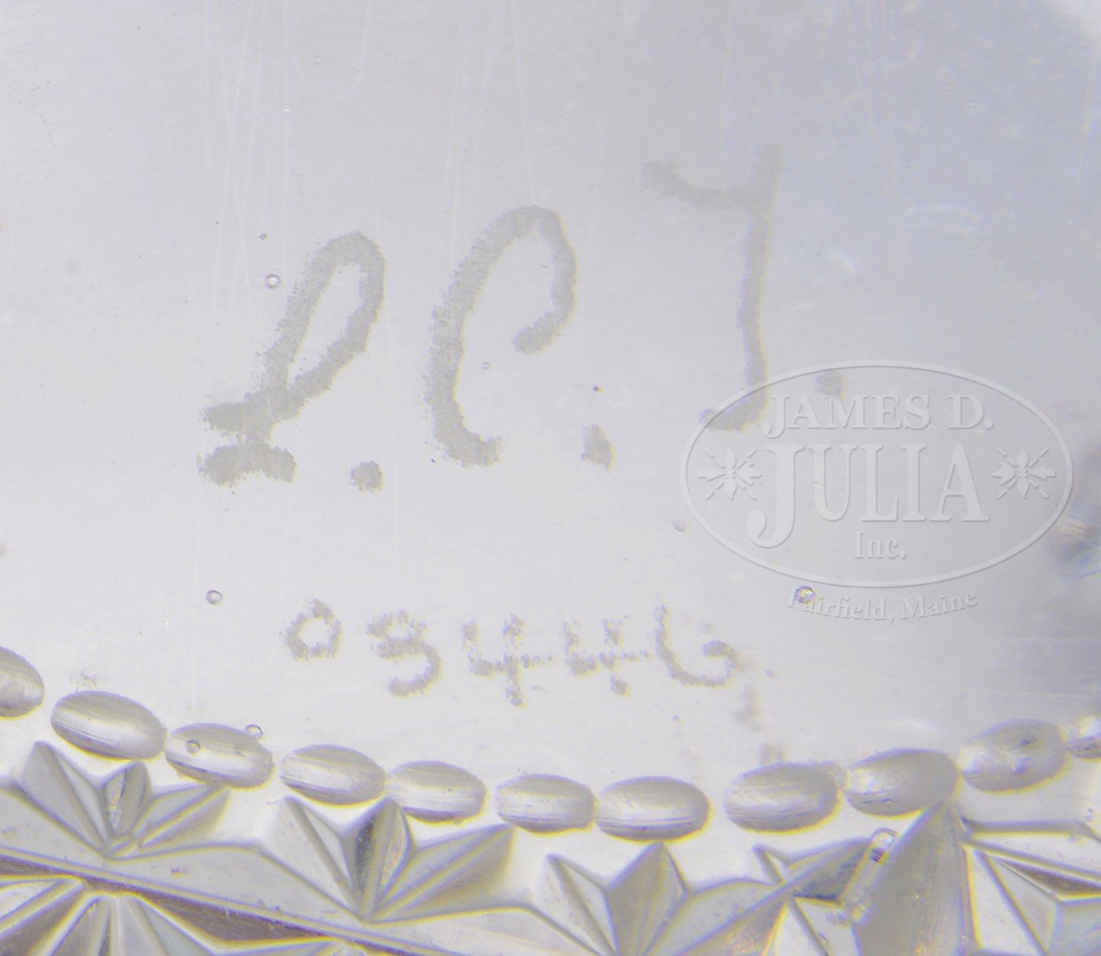 TIFFANY CUT & INTAGLIO CARVED BOWL.Tiffany clear crystal bowl has cut glass design creating four oval panels on the side. Each panel has a pink padded flower and green internal bands. The flower is nicely wheeled carved and leaves are cut into the glass on top of the green internal bands. Signed on the underside “L.C.T. o3446 1708”. SIZE: 6″ dia. CONDITION: Very good to excellent. 5-69159 (15,000-25,000) – Lot 3011