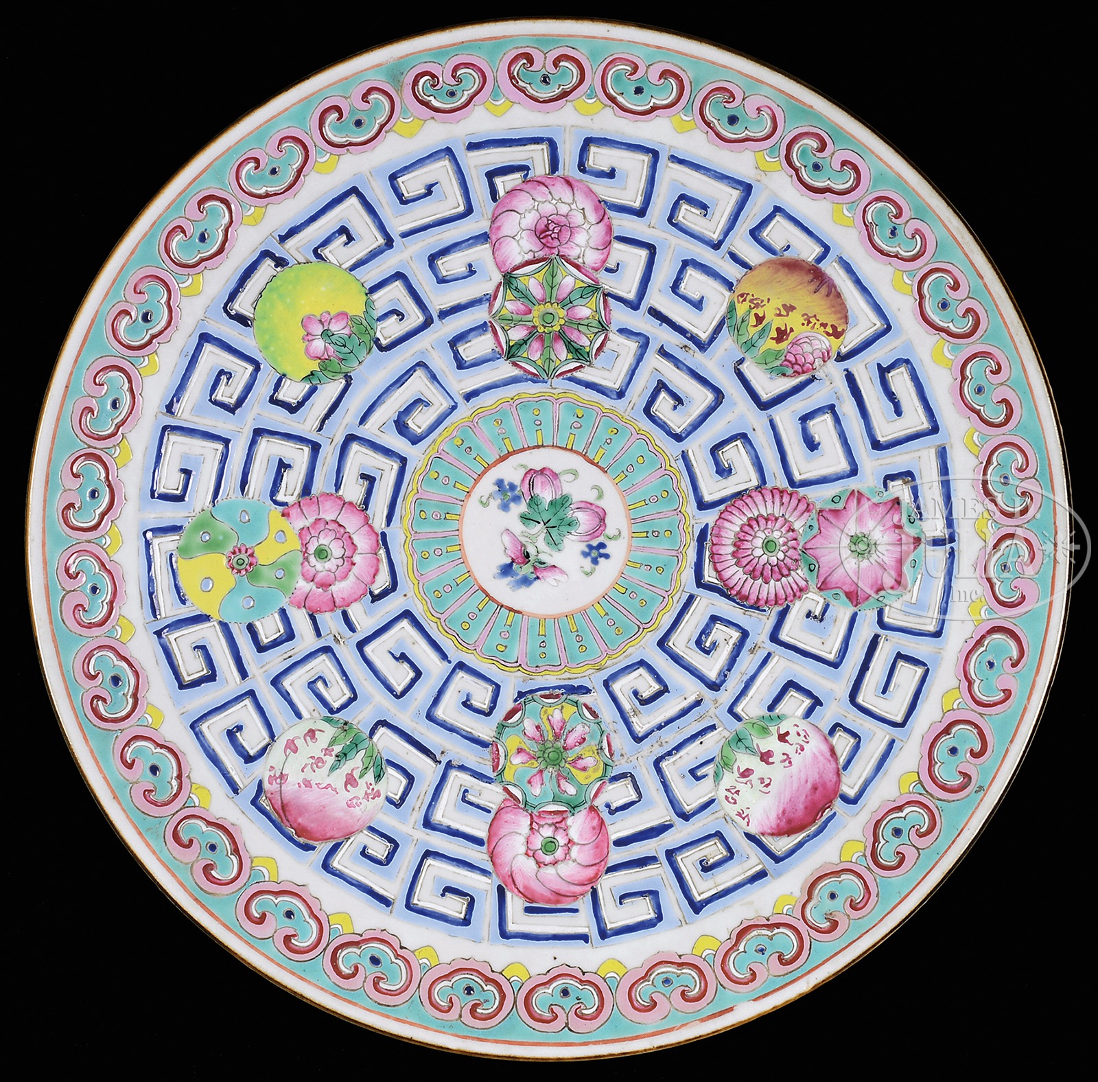 EXPORT FAMILLE ROSE CHARGER.China, 19/20th c. The large charger with motif of flowers in the interior, the rim decorated in scrolling ruyi cloud patterns, designed as export porcelain. SIZE: 15″ dia. CONDITION: Good. 7-75225 (300-500) – Lot 3012