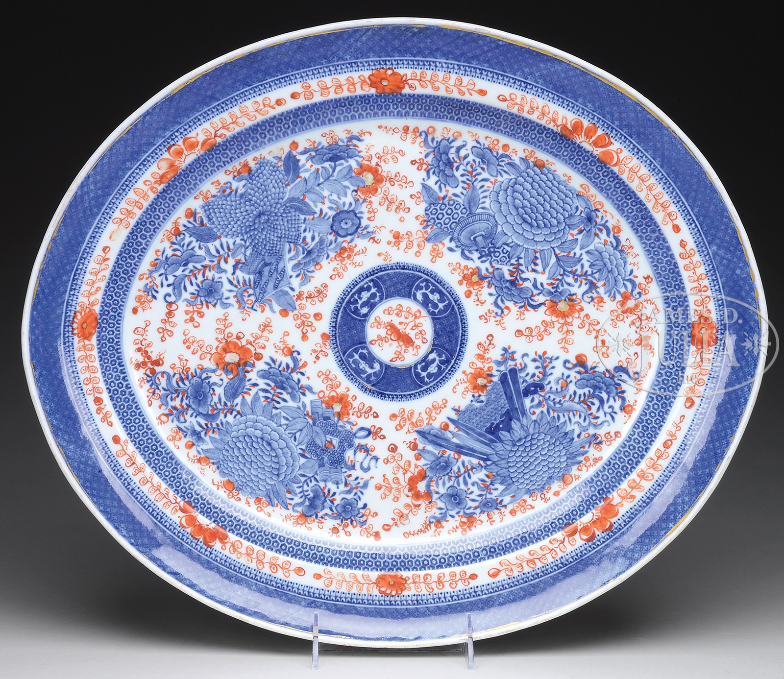 CHINESE EXPORT PORCELAIN PLATTER.19th century, China. Oval form with underglaze blue decoration in Fitzhugh pattern with European red clobbered decoration and mark at the base. SIZE: 17-1/4″. CONDITION: Very good with light wear to enamels. 9-96306 (2,000-3,000) – Lot 3013