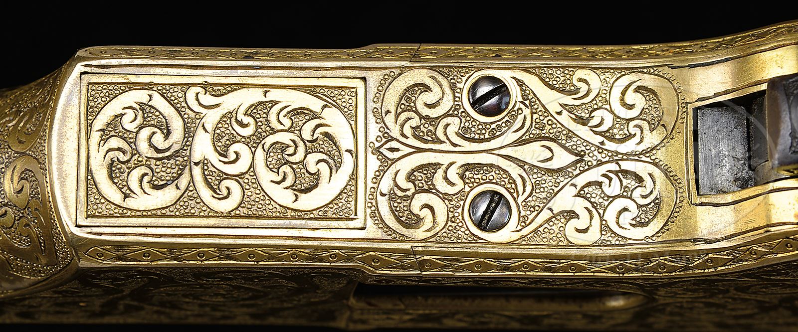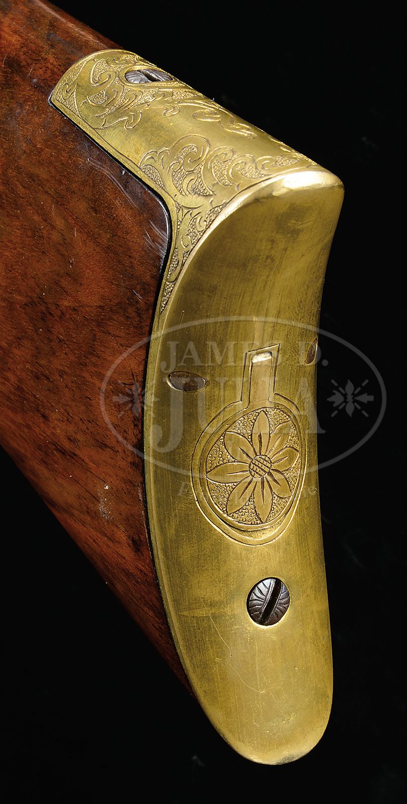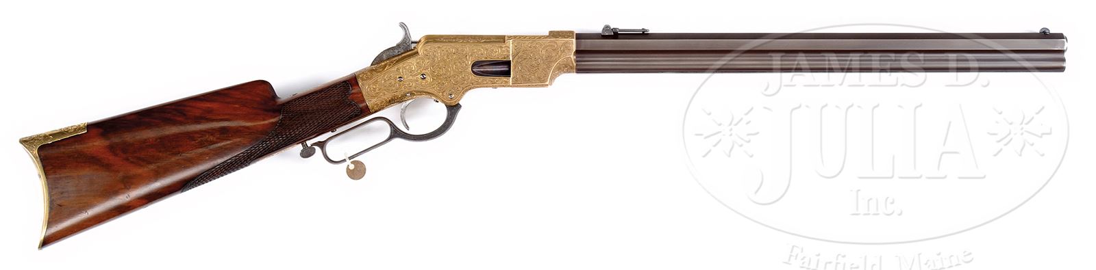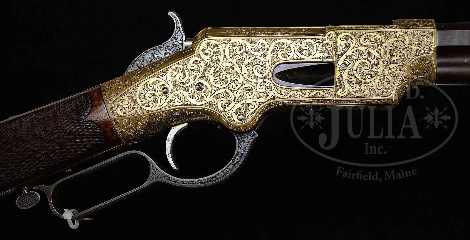 RARE AND UNUSUAL CASED CUSTOM ENGRAVED CONVERSION HENRY LEVER ACTION RIFLE.SN 8068. Cal. .44 American. Wonderful engraved conversion Henry rifle from Peruvian gunsmith Adolfo Birnn of Lima. The conversion consists of shortening the bbl to 19-1/4″ which eliminated the loading sleeve & rnd section of the bbl exactly at the junction of the bbl and loading sleeve. The follower slot in the bottom of the integral magazine was cleverly closed with the addition of a 1-pc metal cover and the installation of a magazine plug at the magazine end which is secured with a screw. The muzzle was machined similar to the orig shape of the Henry muzzle and has had the addition of a custom dovetailed, thin blade, blued steel front sight. The carbine ladder rear sight in the orig dovetail appears have originated with an American Civil War era carbine with alterations. Mounted with very nicely figured custom English walnut straight stock that has a deep cheekpiece and an orig brass crescent buttplate with trap containing an orig 3-pc brass & steel cleaning rod. And additional alteration to the Henry receiver is the addition of a Winchester Model 1866-style loading gate in the right sideplate. Receiver is nicely engraved with full coverage foliate arabesque patterns that has pearled background. Left sideplate is engraved with the large oval vignette of two stags in a forest scene, one running and the other apparently wounded. Left front side flat has a large shield engraved with the initials that appear to be “PJR” or a combination thereof, apparently the person for whom this rifle was customized. Top flat of receiver is engraved “ADOLFO BIRNN en LIMA”. Matching engraving patterns extend over the top and bottom with diamond & dot borders. Engraving further extends over the top & bottom tangs, on the lever & hammer. Buttplate tang is also engraved to match with a well executed flower blossom on the trap door. Magazine cap is also engraved with a matching flower blossom. Tang & buttplate screw heads are nicely engraved. Receiver & buttplate are very nicely gold-washed. SN is only found on left side of bottom tang, under the wood. Lever latch is a custom replacement with larger head, checkered on both sides. Accompanied by an incredible custom, form-fitting, angled, blue velvet lined mahogany casing with the same combination of initials “PJR” inlaid in multi-colored wood on the lid with the prefix “de” and suffix “M”. Exterior of the case is beautifully finished with multi-colored lamination, a diamond shaped, bone lock escutcheon & swinging latches. Interior is form-fitted for the rifle and has three lidded compartments in the front, one of which contains three loose rnds of 44 Webley and the other two are cartridge blocks with holes for 72 cartridges containing 68 rnds of 44 American cartridges. Lids of all three compartments each have two turned wooden pulls. Inside the lid has an attached black leather label embossed in gold “AMERIA / de la M aestranza Geral. / en LIMA 1886 / Adolfo Birnn”. In discussions with other knowledgeable dealers and collectors, this cataloger learned that Mr. Birnn apparently converted only a few of these rifles, possibly only 2 or 3. Once the rim fire cartridge of the orig Henry was supplanted by the advent of the more efficient and re-loadable center fire cartridges there were a few gunsmiths around the world who performed these conversions, although few are known today. It was reported that Mr. Birnn hired European engravers to do the engraving on his conversions. CONDITION: Very fine. Bbl & magazine tube retain virtually all of their strong, custom brown finish. Receiver & buttplate retain virtually all of their bright, gold finish. Lever & hammer are dark patina. Stock is sound with a few light handling & storage nicks & scratches and retains most of its fine custom finish. Mechanics are fine. Bright shiny bore. Case is also fine with numerous, small handling & storage nicks & scratches and retains most of its orig varnish. Interior is moderately faded on the upper surfaces and inside the lid. Bottom is moderately soiled with some light damage from the sights and hammer. Altogether, a beautiful custom package. 49132-1 JR (40,000-70,000) – Lot 3014