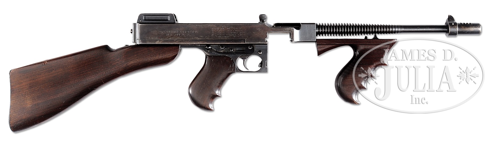 Please Note: The two full views of this lot at the top of the printed catalog was reversed with full views for 3015. The description is complete and correct. Close-up photos are correct. The full view photos have been corrected for both this lot and 3015. There is nothing wrong with this gun, just these two photos. **HIGH ORIGINAL CONDITION COLT 1921A THOMPSON MACHINE GUN (CURIO & RELIC).SN 4888. Cal. 45 ACP. 10-1/2″ bbl. This Colt 1921A Thompson retains its orig 1921 internal parts, and includes one “Seymour” 30 rnd magazine. Front of stock retains visible Remington proof mark. Upper and lower numbers match. Mechanism operates smoothly with proper spring tension. This weapon appears fully functional. This is a National Firearms Act item and requires BATF approval prior to transfer. This item is fully transferable on the ATF Form 3 or Form 4, as Curio & Relic eligible. CONDITION: Overall appearance and finish is extremely fine to near excellent with over 95% deep lustrous orig blue finish with wear to the high edges and scattered light scratches. There is some slight wear where the actuator contacts the edges of the actuator slot. Buttstock has an especially attractive dark brown color with some light dings & very faint scratches. Fewer handling marks on the pistol grip and fore grip. Bore is near excellent, shiny and bright. Magazine retains about 70% of its orig finish. Many collectors who are also shooters prefer the Thompson without the “cutts” compensator as it is easier to clean after firing. 50450-2 JWK34 (25,000-45,000) C&R – Lot 3014