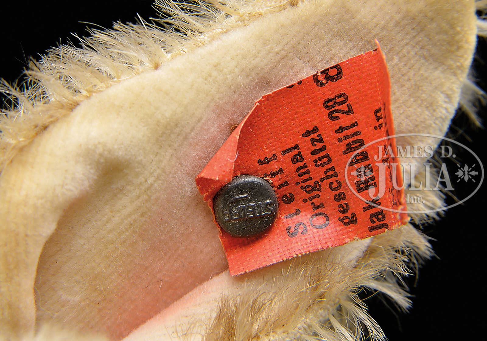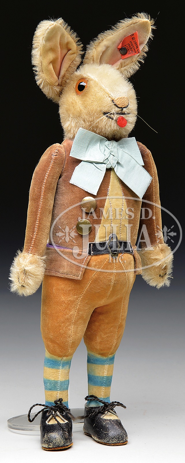 QUITE RARE AND EXCEPTIONALLY COLLECTIBLE STEIFF JACK RABBIT WITH BUTTON.Rabbit is standing and head and arm jointed. He has mohair hands and a mohair head. His clothes, which are integral to his body are made from velvet. He wears black leather shoes with ties, blue and white striped velvet socks, tan shorts, a brown blazer detailed with two brass-like buttons and a large silk tie. Rabbit’s large mohair ears are lined in velvet and are posable with metal wires. Rabbit’s face is detailed with large black and brown glass pupil eyes, brown hand-embroidered nose, and black mouth. He has a tiny red felt tongue and clear monofilament whiskers. This product is based on the character of a famous children’s book written by Uncle Dave Cory and published by Grosset & Dunlop Books. Between 1927-1931, 2780 examples were produced. SIZE: 13″ t (33cm). PROVENANCE: Chuck & Cathy Steffes Collection. CONDITION: Slightly dusty. Otherwise excellent. 1-13795 (2,500-3,500) – Lot 3015 Auction: Advertising, Toy & Doll - Spring 2014 Please Note: All prices include the hammer price plus the buyer’s premium, which is paid by the buyer as part of the purchase price. The prices noted here after the auction are considered unofficial and do not become official until after the 46th day. |