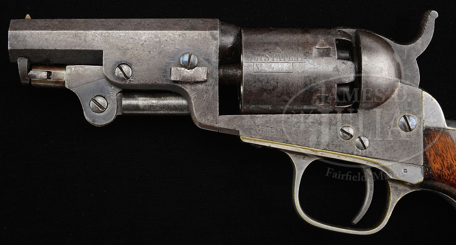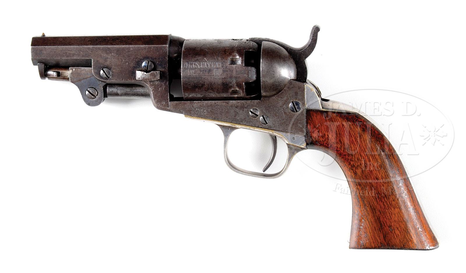 EXTREMELY RARE COLT MODEL 1849 POCKET PERCUSSION REVOLVER WITH 3″ BARREL.SN 183768. Cal 31. Blue and color case hardened with 3″ oct bbl, brass pin front sight and 2-line New York City address with brackets. Left side of frame is marked with a tiny “COLTS PATENT”. Cyl has 6 chambers with stagecoach holdup scene roll markings and all 6 pins prominent and serviceable. The silver plated large guard trigger guard and backstrap contain a varnished 1-pc walnut grip with last 4 digits of matching SN in backstrap panel. This pistol is pictured on pg. 112 of The Book of Colt Firearms, Wilson, identified by SN with credit to the Robert Q. Sutherland Collection. In that photograph it is pictured in an orig Colt casing with accessories which has now been separated from this pistol. According to COLT’S POCKET ’49 IT’S EVOLUTION, Jordan & Watt, on pg. 74 they discuss at some length the 3″ bbl pistols. They estimate that there were only about four hundred 3″ Model 1849 pistols out of the estimated 325,000 pistols produced 1850-1873. This pistol was made in 1860. The referenced publication states that their research, out of 644 revolvers examined, 23 of which had 3″ bbl and only 2 had 6-shot cylinders. The two they identify in the book both have matching numbered cylinders. They also state that it is not unusual for a 6-shot cyl to be unnumbered. They state that replacement unserialized cylinders were available for $2.24 and any 5-shot revolver could be upgraded to 6-shots very easily. Regardless extremely few of these diminutive revolvers survive today. Their tiny loading lever handles were utterly impractical. CONDITION: Fine, all matching except rammer handle and cyl. Bbl retains about 50% orig blue with the balance flaked to a dark patina. Rammer pivot retains dark case colors. Frame shows traces of case colors being mostly a mottled gray/brown patina. Cyl is a blue/brown patina with a patch of rust on one area and shows about 65-70% stagecoach holdup scene roll marking. Trigger guard and backstrap retain about 95% orig silver. Grip is sound showing light edge wear and retains most of its orig varnish. Mechanics are fine. Strong bore with some shine and light pitting. One of the finest examples known. 4-54294 (8,500-12,500) – Lot 3015 Click here to view provenance