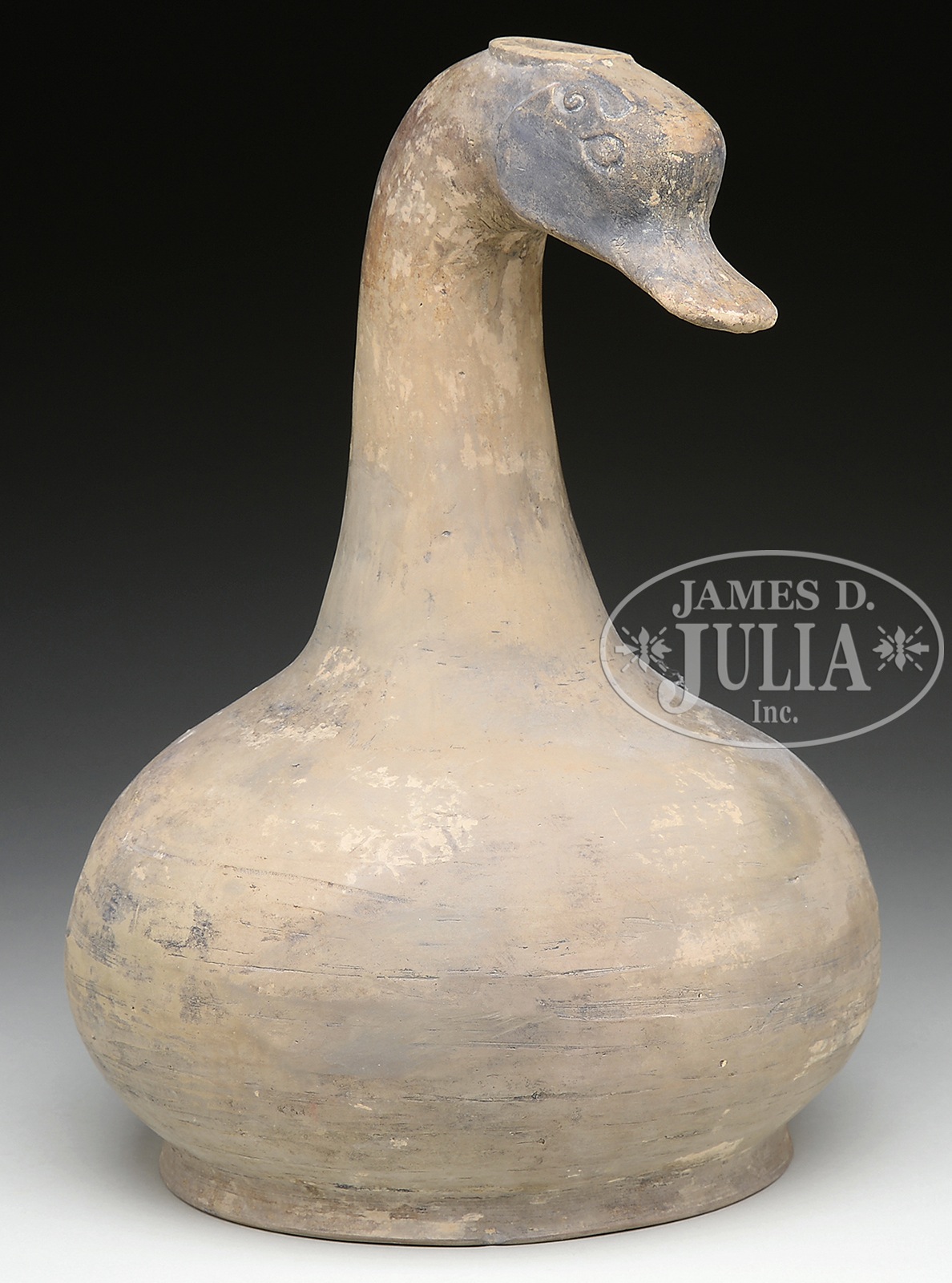 DUCK FORM POTTERY JAR.China. Made from a grayish clay, the rounded body tapering to a long neck and ending in the head of a duck. SIZE: 13-3/4″ h. CONDITION: Two chips to the foot. 49818-80 (100-200) – Lot 3015