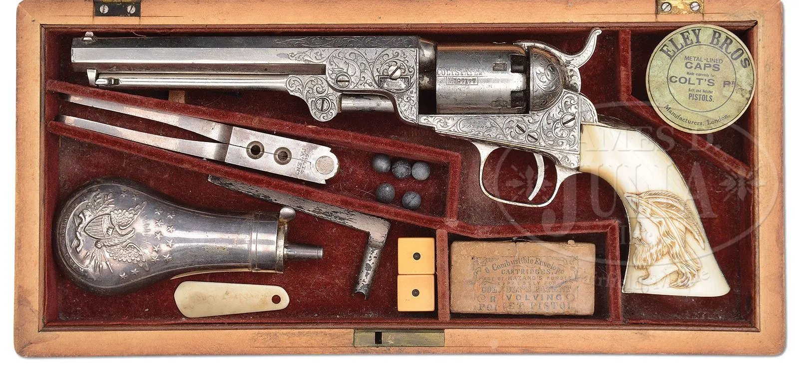 James D. Julia Auctioneers complies with all federal laws and regulations (Please review our Ivory Position Statement): As per the President’s Executive Order of February 2014, this item with its ivory is legal to sell and buy provided there is an ESA “Antique Certification” document proving the age. You must purchase an ESA in order to take possession of the ivory. If you wish to acquire the ivory after you purchase this gun, you must hire John Sexton, who is an independent consultant with the appropriate qualifications to prepare ESA certifications accepted by government agencies. John’s address is: 1962 Portage Landing North, North Palm Beach, FL 33408. ESA statements prepared by John Sexton can be acquired for a cost of $1,500.00/each. It is the buyer’s responsibility to make payment to John for the ESA statements. The documents are prepared by John and not by James D. Julia Auctioneers. Once the ESA statement is prepared and provided to Julia’s, you can have the ivory mounts. Be sure to keep a copy of your ESA certificate for your records also. THIS GUN IS BEING SOLD WITHOUT THE IVORY MOUNTS. YOU WILL NOT RECEIVE THE IVORY AT THE TIME OF YOUR PURCHASE. IF YOU WISH TO ACQUIRE THE IVORY ITEMS, YOU MUST PURCHASE AN ESA “ANTIQUE EXEMPTION” CERTIFICATE. NO EXCEPTIONS! RARE CASED SILVER-FINISHED AND ENGRAVED COLT MODEL 1849 POCKET PERCUSSION REVOLVER W/POSSIBLE GARABALDI GUARD CONNECTION.SN 187177. Cal. 31. Nickel finish with 6″ oct bbl, scarce dovetailed front sight with 1-line New-York U.S. America address. Left side of frame has “COLT’S PATENT” engraved in a pillow shape. Cyl has stagecoach hold-up scene roll marking and six chambers. The brass, large guard trigger guard and backstrap contain a spectacular 1-pc ivory grip that has the raised, carved head on the left side of a man who appears to be that of Guiseppe Garabaldi for whom a unit called the Garabaldi Guard was named. It was raised in May of 1861 and mustered into service Jun. of 1861 and fought completely through the war and was mustered out July 1865. They had a very distinguished career and fought in a number of significant battles including Gettysburg and several other hotly contested battles. They had eight officers and 107 enlisted men killed and mortally wounded during their service along with one officer and 158 enlisted men died from disease. Revolver is engraved by Gustave Young with full coverage foliate arabesque patterns on the frame which has several scrolls terminating in flower blossoms. Engraving extends over the bbl lug and rammer pivot with Mr. Young’s trademark dogs head on the left side and flower blossoms on the right side. Backstrap, buttstrap & trigger guard are engraved to match with Mr. Young’s trademark fan pattern at the top. Hammer is also deluxe engraved with wolfs heads on each side of the hammer nose. Accompanied by a rare burgundy velvet lined Colt maple or applewood casing that has the colorful figure of a man in very early style clothing applied to the lid. Interior is compartmented, probably for a 6-1/2″ Colt Model 1862 Police percussion revolver, a silver plated double-sided eagle & stars flask, a silver plated “Colts Patent” mold without sprue cutter, a silver plated L-shaped nipple wrench, a partial packet of combustible cartridges, an ivory screw-top bits box with Eley cap tin label on top, a pair of dice and an ivory pendant. All of the serial numbers on the bottom of the revolver are accompanied by a small “I” which indicates it was to receive ivory grips. Several of the screw heads are engraved, as are ends of wedge. There is a drawing in the accompanying pages which shows the Garibaldi Guard marching past Pres. Lincoln in 1861. Their uniforms resemble the colorful figure on top of the case. CONDITION: Very good to fine, all matching except grip. Overall retains most of an old silver finish with some scattered fine pitting; cyl retains most of its plated finish and shows about 30% stagecoach hold-up scene roll marking; hammer screw, wedge screw, trigger guard and top of the backstrap screws are replacements. Grip has a couple of age lines but is completely sound with a wonderful, mellow ivory patina. Mechanics are fine; strong bore with moderate pitting. Case has a couple of grain checks in the lid and a few more in the bottom, otherwise is sound with a few light nicks & scratches and retains most of what appears to be it’s orig finish; interior is lightly faded & soiled with solid partitions; flask retains about all of its orig silver finish; mold retains most of its silver finish; cartridge packet has been opened and repaired; other accessories are fine. 4-51230 (30,000-50,000) – Lot 3016 Click here to view provenance