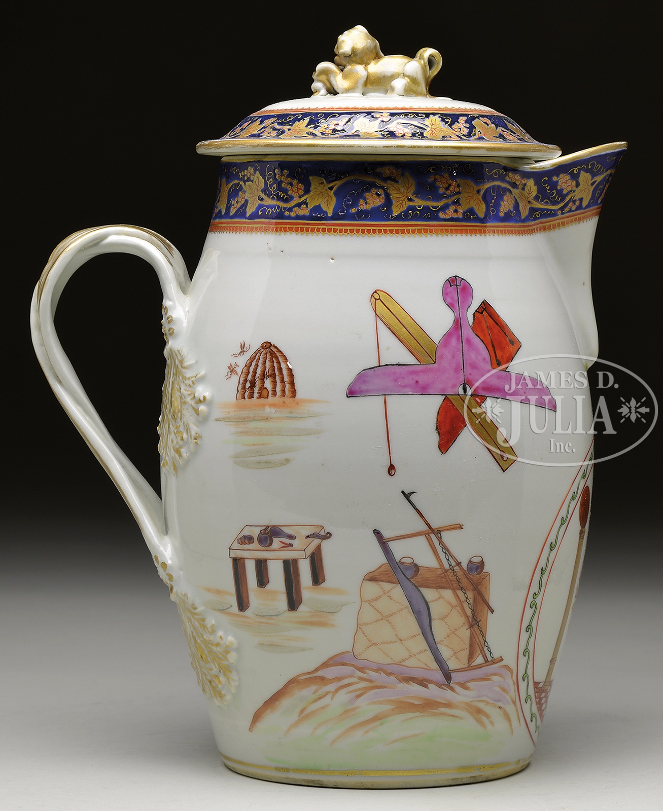 CHINESE EXPORT MASONIC PORCELAIN CIDER JUG.Late 18th century. Of barrel form with entwined reeded strap-handle and crouching lion finial, the cover and sides painted with Masonic emblems, the rims with a gilt grapevine design cobalt blue band. SIZE: 11″ h x approx 6″ dia. PROVENANCE: Massachusetts collection of Sherwood Smith. Northeast Auctions, March 2, 2002, Lot 5. From a fine private Long Island, NY collection. CONDITION: Professional restoration, slight normal and expected wear to gilding on handle. 9-93320 (2,000-3,000) – Lot 3017