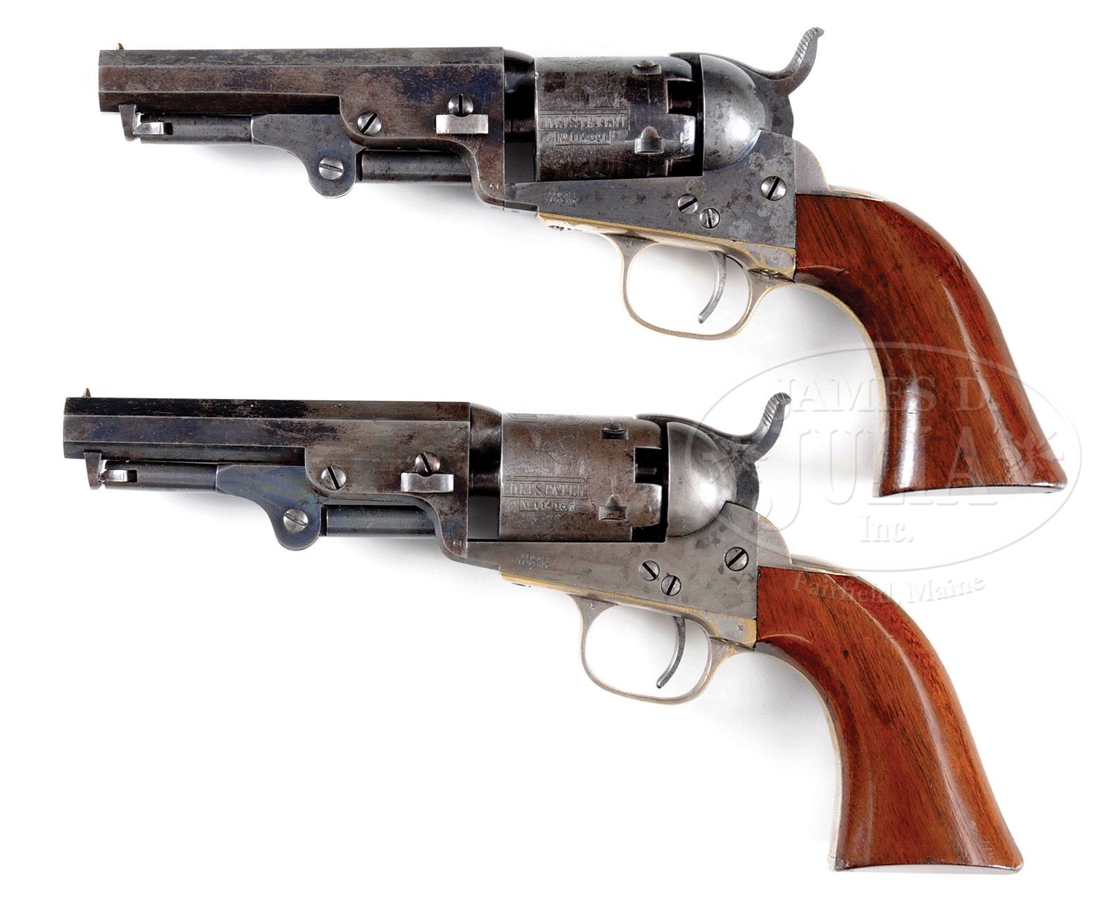 Please note: The ivory knob on the compartment is missing. SCARCE CASED BRACE OF COLT MODEL 1849 POCKET PERCUSSION REVOLVERS.SN 114167/114291. Cal. 31. Revolvers both have 4″ oct bbl, brass pin front sight and 2-line New York City address. Left side of frames are marked with a small “COLTS PATENT”. They have silver plated brass trigger guards and backstraps containing 1-pc walnut grip with last four digits of matching SN in respective backstrap channels. Cylinders have stagecoach hold-up scene roll marking with five chambers. Accompanied by an aftermarket fitted mahogany double casing, probably by the late Bob Els. Case is burgundy velvet lined with green trim, French fitted in the bottom for both revolvers, a double sided, early eagle flask, a brass “COLTS PATENT” mold without sprue cutter, a packet of six combustible cartridges and a small lacquered tin of Eley’s caps. Left front corner has a matching fabric covered compartment with ivory pull containing lead balls. This set is pictured in color on p.248 of COLT’S POCKET ’49 IT’S EVOLUTION, Jordan & Watt with credit to another auction house. CONDITION: SN 114167: Fine, all matching including rammer, wedge, cyl & grip. Bbl retains 60-65% glossy orig blue with the balance flaked to a light patina; rammer & pivot retain dark case colors; frame retains about full coverage smoky case colors; hammer a mottled patina; cyl is a grey metal patina with all five safety pins serviceable and shows about 95% stagecoach hold-up scene roll marking; trigger guard & backstrap retain about 90% orig silver. Grip is sound showing light wear and retains virtually all of its orig varnish. Mechanics are fine; strong bright bore with light pitting. SN 114291: Fine, all matching including rammer, wedge, cyl & grip. Bbl retains about 50% orig blue mixed with flaked areas of light patina; rammer retains traces of case colors; frame retains about 75-80% smoky case colors on the left side, stronger and brighter on the right side; hammer retains dark case colors; cyl retains about 60-65% thin blue with four of five safety pins serviceable and shows about 98% stagecoach hold-up scene roll marking; trigger guard & backstrap retain most of their orig silver finish. Grip is sound showing light wear with a few nicks & scratches and retains most of the orig varnish. Mechanics are fine; bright shiny bore. Case has a ding and a small crack in the bottom otherwise is sound with usual nicks & scratches and retains most of its orig varnish; interior is moderately faded with light soil; flask is fine with one small ding and retains about 85% orig finish; mold is extremely fine with some minor battering on the right side; other accessories are fine. 4-53517 (15,000-20,000) – Lot 3018