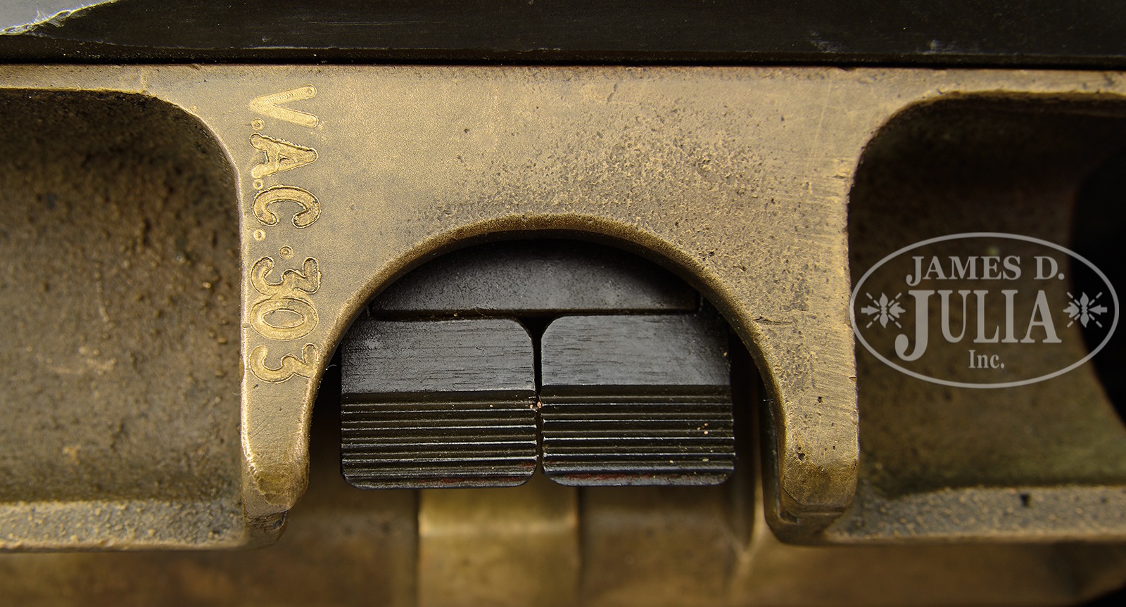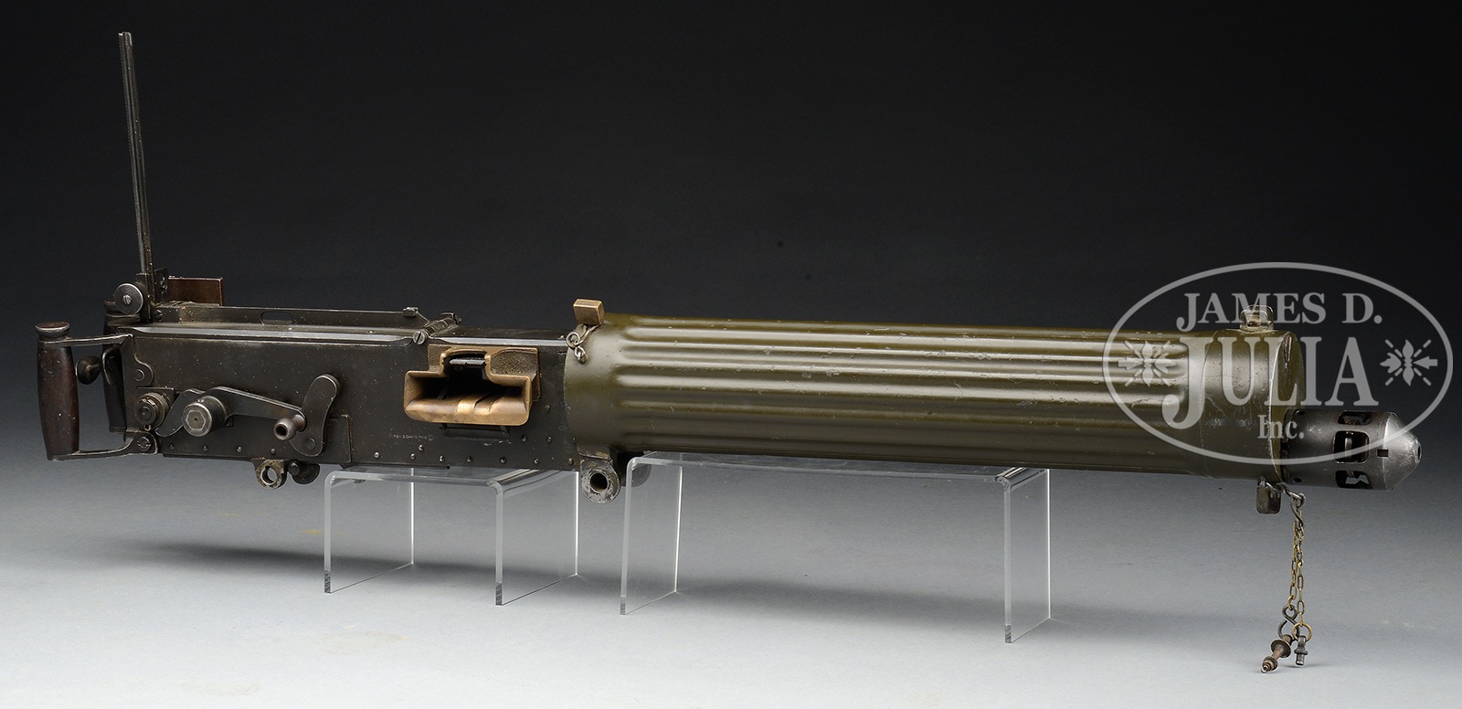 **FLUTED VICKERS .303 WATER COOLED MACHINE GUN (PRE-86 DEALER SAMPLE).SN 3687. Cal. 303 British. 28-1/2″ bbl. This fine example of the Vickers machine gun is marked on the top of the water jacket “V.S.M.” followed by “7.92/303” and comes with an orig wooden transit chest. Right sideplate is marked “BNP 7.9 M/M 2.244″ 18 TONS” followed by “BELLO WPR.FT” (dealer information). This indicates as does the current registration paperwork that this gun was at one time in 8mm Mauser. Currently, however, it is in .303 British with an appropriate feed block, bolt and bbl. Rear sight is marked “V.A.C. 303 VII no 2 mk I”. This specimen retains the rare dial sight bracket affixed to the left receiver plate, with the appropriately longer backplate retaining pin. Water fill plug is brass & water drain plug present. Steam hose cork not present. Firing mechanism moves smoothly when operated by hand, this weapon appears fully functional. This is a National Firearms Act item and requires BATF approval prior to transfer. This weapon is transferable only to current FFL and SOT license holders on an ATF form 3 as a pre-86 dealer sample and current transfer form is marked “LIMITED TO USE AS SALES SAMPLE”. This weapon in this status maybe retained by the FFL/SOT license holder privately when they relinquish their license, subject to adherence to state and local laws and approval by the BATF. CONDITION: Overall finish and appearance is fine retaining most of its orig dark brown finish with dark olive paint on jacket which has numerous small chips with brassing at the tripod mounting points. Internals are clean and serviceable, bore is pitted with distinct rifling. Wooden handles are sound and serviceable with some handling marks. Transit chest lid is no longer attached to the hinges and is cracked with some significant dings and gouges, however, with a little effort it could be made serviceable. There is a staining of red cellophane tape on both ends, which again with some care could be removed. Vickers guns are renowned for their endurance during firing tests and the recent renewed availability of .303 cartridges has breathed new life into the shooting of guns in this caliber. They are also the most versatile of guns to convert to other calibers. 50726-3 JWK47 (5,500-10,000) C&R – Lot 3018