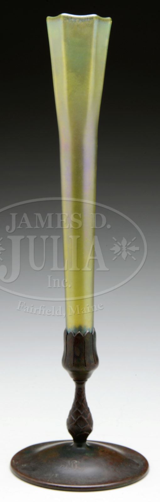 TIFFANY STUDIOS FAVRILE VASE.Tiffany vase has bronze Tiffany Studios holder with artichoke stem and stylized floral design cup. Base is signed “Tiffany Studios N.Y. 1043”. Base houses a tall slender gold favrile vase that flares at the top to a hexagonal lip. Vase is signed on the underside “L.C.T. Favrile”. SIZE: 15-7/8″ t. CONDITION: Some very minor roughness to bottom edge of glass insert, otherwise very good to excellent. 5-69399 (1,000-2,000) – Lot 3019