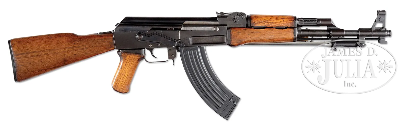 **FANTASTIC VIET NAM WAR TROPHY, CHINESE TYPE 56 MACHINE GUN (FULLY TRANSFERABLE).SN 12072376. Cal. 7.62 X 39 MM. 16-1/4″ bbl. This Type 56 under-fold bayonet milled steel receiver machine gun was manufactured by Chinese factory “66” and includes it’s orig web and leather sling and one 30 round mag. All parts appear to be orig and matching. Consignor states that he captured this weapon from an enemy medic, brought this gun home and safeguarded it. “Republic of China” is the information appearing on current registration form, manufactures block 4A, model is “AK 47” in block 4D. Firing mechanism moves smoothly when operated by hand, this weapon appears fully functional. This is a National Firearms Act item and requires BATF approval prior to transfer. This weapon is fully transferable on an ATF form 3 or form 4. CONDITION: Overall appearance and finish is absolutely outstanding, finest orig specimen this cataloger has ever seen. Metal finish starting to thin is some places with some tinges of brown. Bolt and op-rod near excellent, shiny and bright. Bore is excellent, shiny and bright. Wood has some nicks, bruises and handling marks but considering it’s history, this is to be expected. Sling is still strong and serviceable with leather just starting to flake on surface, pretty much impossible to upgrade this highly sought after and desirable specimen. 50409-1 JWK40 (20,000-40,000) – Lot 3020