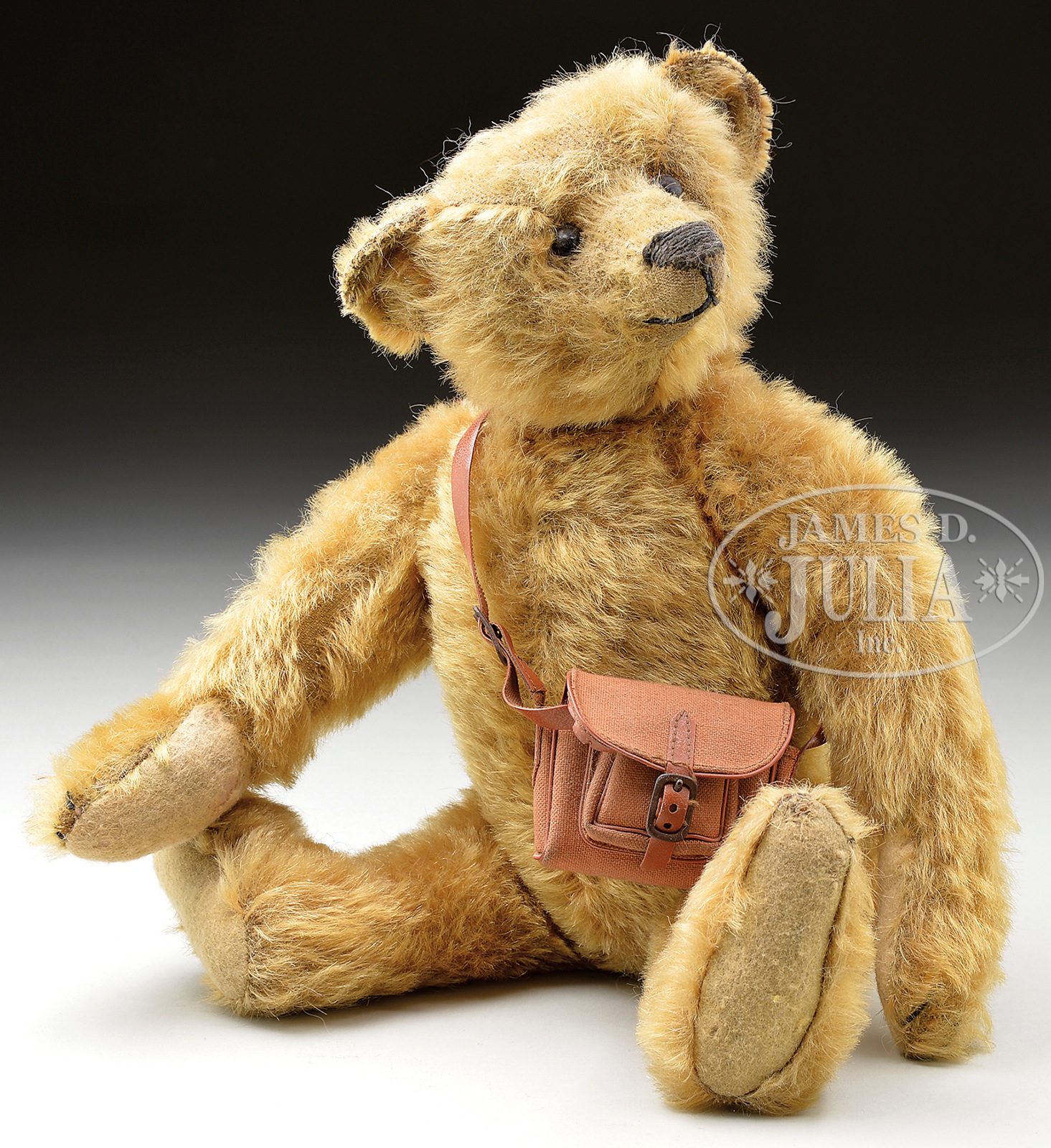 CHARMING EARLY GOLD STEIFF BEAR WITH BUTTON.Circa 1907, hard stuffed, 5-ways jointed Steiff bear made from gold colored mohair. Teddy has early and traditional Steiff proportions including a pronounced back hump, long arms, and long narrow feet. His face is detailed with black shoebutton eyes and a black hand-stitched nose and mouth. Teddy has four claws on each paw. Comes with satchel added later. Teddy retains his trailing “F” Steiff button as his ID. Adorable face and personality. SIZE: Overall 13″ t (34cm). Sitting 9″ t (22cm). PROVENANCE: Chuck & Cathy Steffes Collection. CONDITION: Minor professional repairs on pads. Some light playwear, but otherwise very good. 1-13865 (2,500-4,500) – Lot 3021 Auction: Advertising, Toy & Doll - Spring 2014 Please Note: All prices include the hammer price plus the buyer’s premium, which is paid by the buyer as part of the purchase price. The prices noted here after the auction are considered unofficial and do not become official until after the 46th day. |
