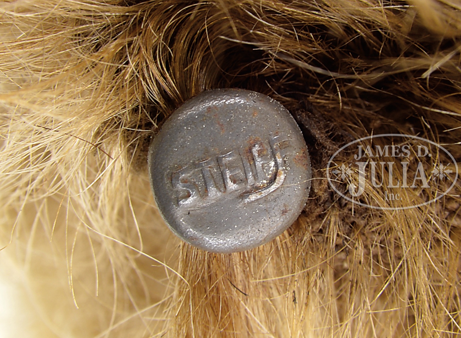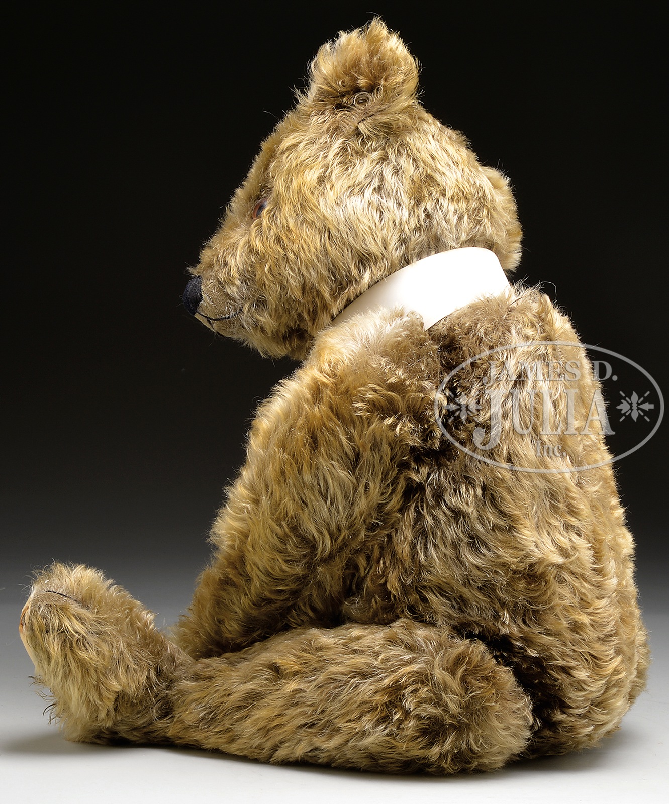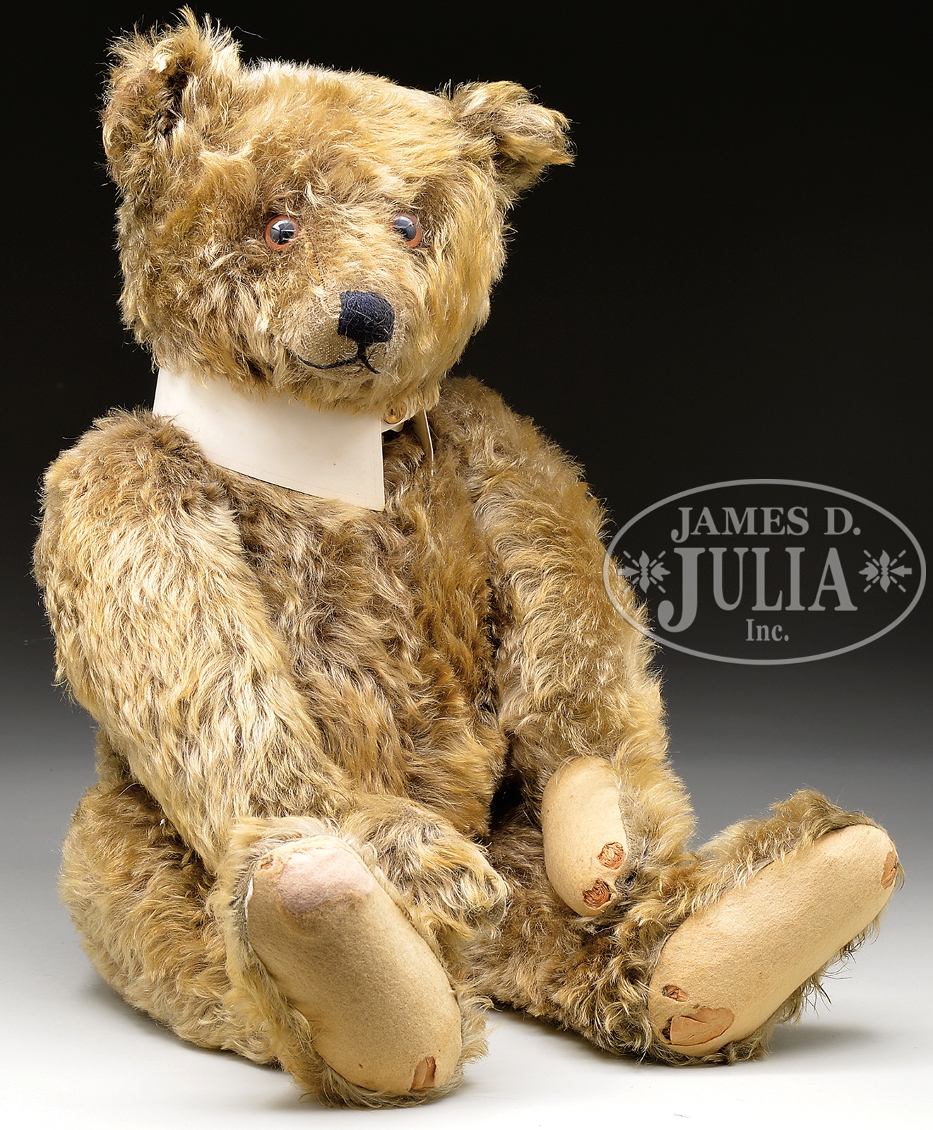 HANDSOME BROWN STEIFF 1920s ERA TEDDY BEAR WITH BUTTON.This sweeter than chocolate bear is made from long brown shaggy mohair which has faded slightly over time. He is 5-ways jointed, and solidly stuffed. Teddy has cream colored hand and paw pads. His face is detailed with over-sized black and brown glass pupil eyes, a trimmed muzzle and a black hand-embroidered nose and mouth. Teddy has four black claws on each paw. Teddy retains his larger trailing “F” button. This bear has an irresistible facial expression and a warm and delightful presence. SIZE: Overall 27″ t (69cm). Sitting 18″ t (45cm). PROVENANCE: Chuck & Cathy Steffes Collection. CONDITION: Light playwear and minimal mohair thinning. Hand paws with light wear and a few holes. Cardboard lining can be seen in the soles of the paw pads. Possible partial nose restitching. The right paw pad and one ankle has been professionally restored. Otherwise very good. 1-13832 (5,000-7,000) – Lot 3023 Auction: Advertising, Toy & Doll - Spring 2014 Please Note: All prices include the hammer price plus the buyer’s premium, which is paid by the buyer as part of the purchase price. The prices noted here after the auction are considered unofficial and do not become official until after the 46th day. |