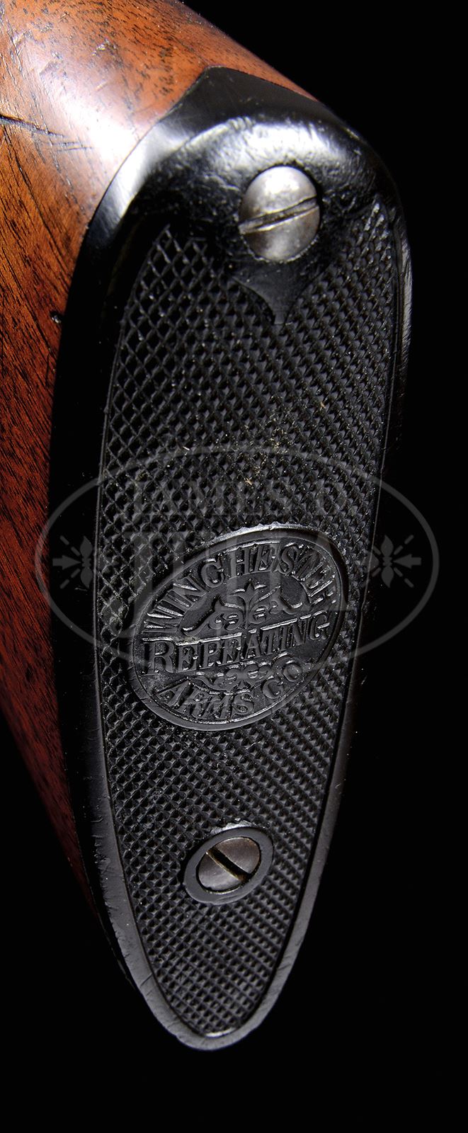 *EXTREMELY RARE POSSIBLY ONE OF A KIND WINCHESTER MODEL 1873 SEMI-DELUXE SMALL BORE LEVER ACTION RIFLE.SN 555264. Cal. .22 Short. Extremely rare small bore ’73 with 24-1/4″ oct bbl, full magazine, Lyman “certifiable antique ivory” bead hunting front sight and flat top rear sight. Mounted with uncheckered straight grain American walnut which includes standard forearm and the very rare “Plain” capped pistol gripped stock that has Winchester Repeating Arms Co. trademark embossed hard rubber buttplate. Left side of lower tang, under the wood is marked with the assembly no. 11372 & “CF R”, matching assembly number is also found in top tang channel of buttstock. Inside magazine tube is original. Accompanied by a Cody Firearms Museum Records Office search form which identifies this rifle in cal 22 short with oct bbl, plain trigger, plain pistol grip, rubber shotgun buttplate, Lyman hunting front and flat top rear sights. Received in warehouse Dec 14, 1900 and shipped the next day to order no. 83714. According to Flayderman’s Guide to Antique American Firearms there were only 19,552 of these small bore rifles were produced in the period 1884-1904, in two calibers and two bbl lengths. This was the first repeating rifle chambered for the .22 manufactured in America. It was not considered to be a serious hunting rifle and was therefor relegated to being a garden pest gun and small game rifle for boys and ladies. These rifles usually saw very hard service with little or no maintenance and are usually found today with little or no orig finish. Of the total produced extremely few were special ordered such as found here and few of those survive today. This is one of the most rare 1873 rifles. Special Note: This item contains or is made of ivory. Do not bid on this lot unless you have read and agreed to our "Ivory Position Statement" and the "Waiver of Legal and Financial Risk to James D. Julia in regards to your Purchase of an Ivory Object." This information is located in the front section of our catalog. CONDITION: Very fine plus, all matching. Bbl and magazine tube retain 96-97% strong orig blue with a few scattered spots of rust on top right flat and one area on magazine tube. Receiver retains about 85-88% strong orig blue with candy striping on both sides & flaking on left side plate. Top and bottom edges are somewhat dulled as are the top and bottom tangs. Hammer retains very bright orig case colors, lightly to moderately faded on left side. Lever retains traces of case colors on the sides having mostly faded to silver. Wood is sound with a few light nicks and scratches and a couple small gouges on the forearm and overall retains most of its orig oil finish. Mechanics are crisp, brilliant shiny bore, shows very little use. 49491-1 JR C&R; IVORY (20,000-30,000) – Lot 3024 Click here to view provenance