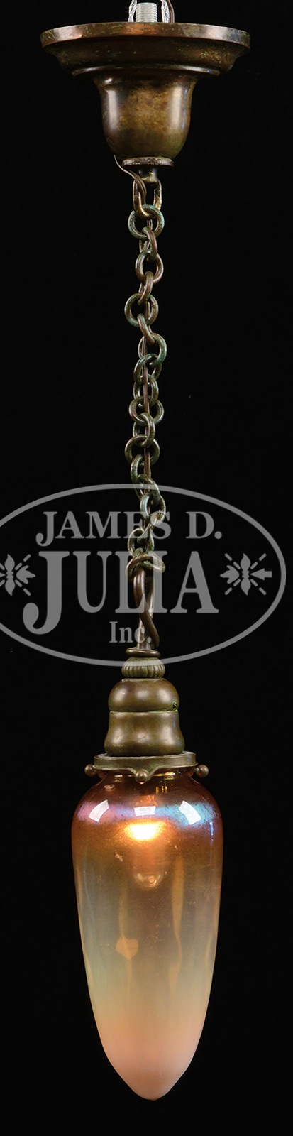 Beautiful little Tiffany lamp has stalactite shade with orange iridescence at top shading to very light orange iridescence to a milky white at point. Shade has very light D.Q. pattern and is signed inside fitter rim “LCT M925″. Shade has original paper tag on side. Shade is suspended from bronze socket with stylized loop at top, which attaches to chain leading to ceiling cap. SIZE: Shade is 8″ l with 2-1/4″ fitter. Overall length is 26-1/2″. CONDITION: Shade is very good to excellent. Fixture, chain and ceiling cap, appear to have different patinas, otherwise very good to excellent. 49101-10 (1,000-1,500) – Lot 3024
