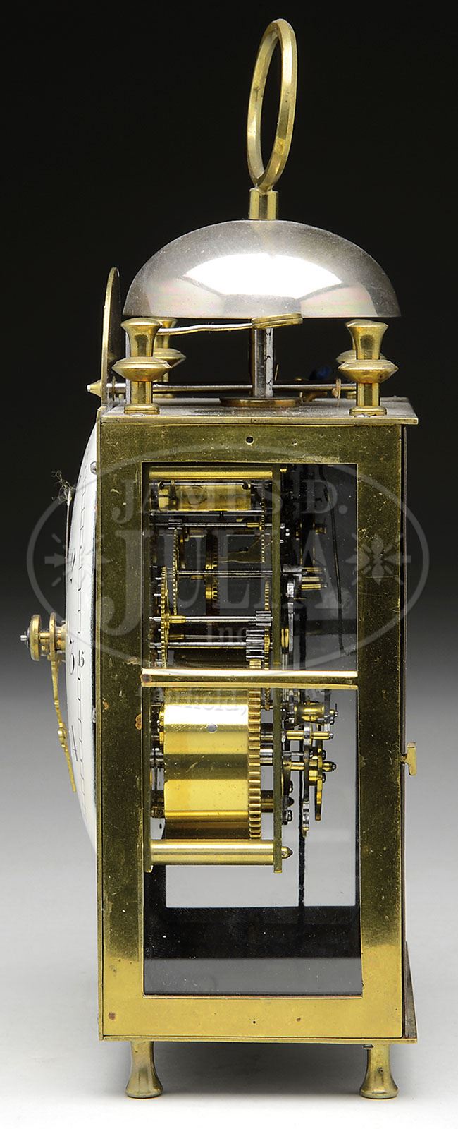 FRENCH BRASS CAPUCINE TRAVEL CLOCK. Early 19th Century, brass case with top mounted bell and carrying handle, round painted convex porcelain dial with Roman numerals, time, strike and alarm movement with verge escapement, brass movement, having turned brass feet and finial. SIZE: 10-1/2″ H. CONDITION: Very good. 9-90518 (1,000-2,000)