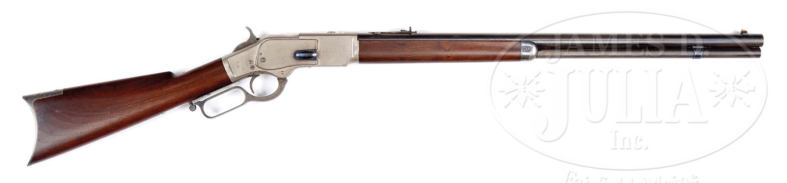 EXTREMELY RARE WINCHESTER FIRST MODEL 1873 LEVER ACTION RIFLE.SN 627. Cal. 44 WCF (44-40) Standard grade, 2nd year of production rifle with 24-1/4″ rnd bbl, full magazine, half nickel front sight and reverse mounted, early, V-notch rear sight with checkered edges. Receiver is first type with first type mortised dust cover that has raised checkered thumb print. Mounted with nicely figured, uncheckered American walnut with straight stock and crescent buttplate with trap. Left side of lower tang, under the wood is marked with the assembly no. 18 and an “R”. Matching assembly number is also found in top tang channel of buttstock & inside toe of buttplate. Receiver, sideplates and dust cover are nickel finished. Forend cap appears to have been originally blued and buttplate is color case hardened. This rifle will letter with 24″ rnd bbl, received in warehouse Mar 21, 1874 and shipped Apr 1, 1874 to order no. 1203, no mention is made of the nickel finished receiver, however, there is no doubt that the finish on this rifle is absolutely authentic and real. Undoubtedly this rifle was the property of someone of importance or of a wealthier class than the common working man. These early ’73 rifles were in great demand with their introduction. They were the first successful, center fire repeating rifles available in quantity and were used by citizens from every walk of life from law enforcement to outlaws, the common working man/cowboy, ranchers and hunters. These early rifles are almost never found with any orig finish. PROVENANCE: The Estate Collection of Phil A. Bleakney, Jr. CONDITION: Very fine, all matching. Bbl and magazine tube retain strong blue in sheltered areas with the balance fading and turning plummy. Receiver, side plates, dust cover & carrier retain about 96-97% strong orig nickel, turning a little milky. Loading gate retains about 90% orig fire blue. Hammer retains about all of its orig case colors, slightly darkened. Lever retains strong case colors on the sides and trigger bow with outer faces of finger loop fading to silver. Buttplate retains 85-90% bright case colors, mostly on the face with the tang fading and with light rust on the heel and toe. Wood is sound with light nicks and scratches and retains strong orig oil finish, showing wear on the carry point of the forearm. Mechanics are crisp, very bright shiny bore with a few scattered small spots of roughness. 49059-19 JR (15,000-25,000) – Lot 3026