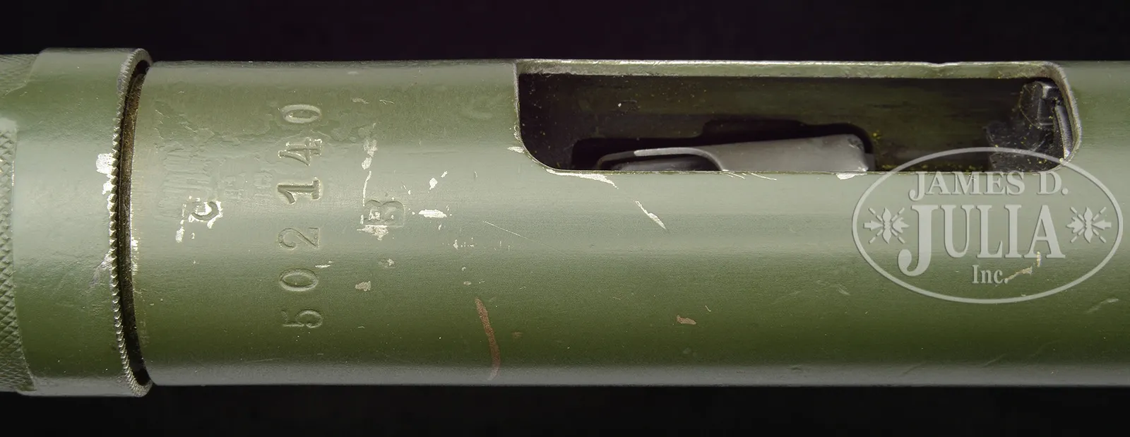 **FINE ORIGINAL CARL GUSTAV SWEDISH “K” M45 MACHINE GUN (PRE-86 DEALER SAMPLE).SN 502140. Cal. 9mm. 8-1/2″ bbl. This fine example of the Swedish “K” retains it’s attractive military green painted finish and black hard rubber cheek rest on the folding metal stock. It comes with 1 orig Parkerized 34 round mag. Swedish crown proof marks visible. Bbl matches receiver. Sling swivels present and serviceable. Firing mechanism moves smoothly when operated by hand, this weapon appears fully functional. This is a National Firearms Act item and requires BATF approval prior to transfer. This weapon is transferable only to current FFL and SOT license holders on an ATF form 3 as a pre-86 dealer sample. This weapon in this status maybe retained by the FFL/SOT license holder privately when they relinquish their license, subject to adherence to state and local laws and approval by the BATF. CONDITION: Overall appearance and finish extremely fine with 95% coverage orig green enamel paint on metal parts & Parkerized finish on mag. Some scrapes and dings to bare metal. Wooden handgrip also shows some dings and handling marks as does the hard rubber cheek rest, which has a noticeable line about 1/2″ forward of the rear. Bolt face extremely fine. Well used bore with worn lands and dark in the grooves. These Swedish “K” sub-machine guns are considered one of the best of their genre by experienced machine gun enthusiasts. Trouble free accurate and comfortable to shoot, no doubt someone is going to be very happy with this offering. 50726-1 JWK50 (5,000-8,000) C&R – Lot 3027