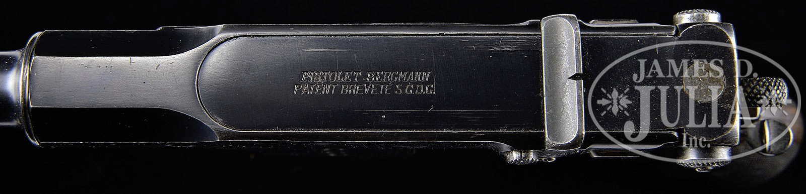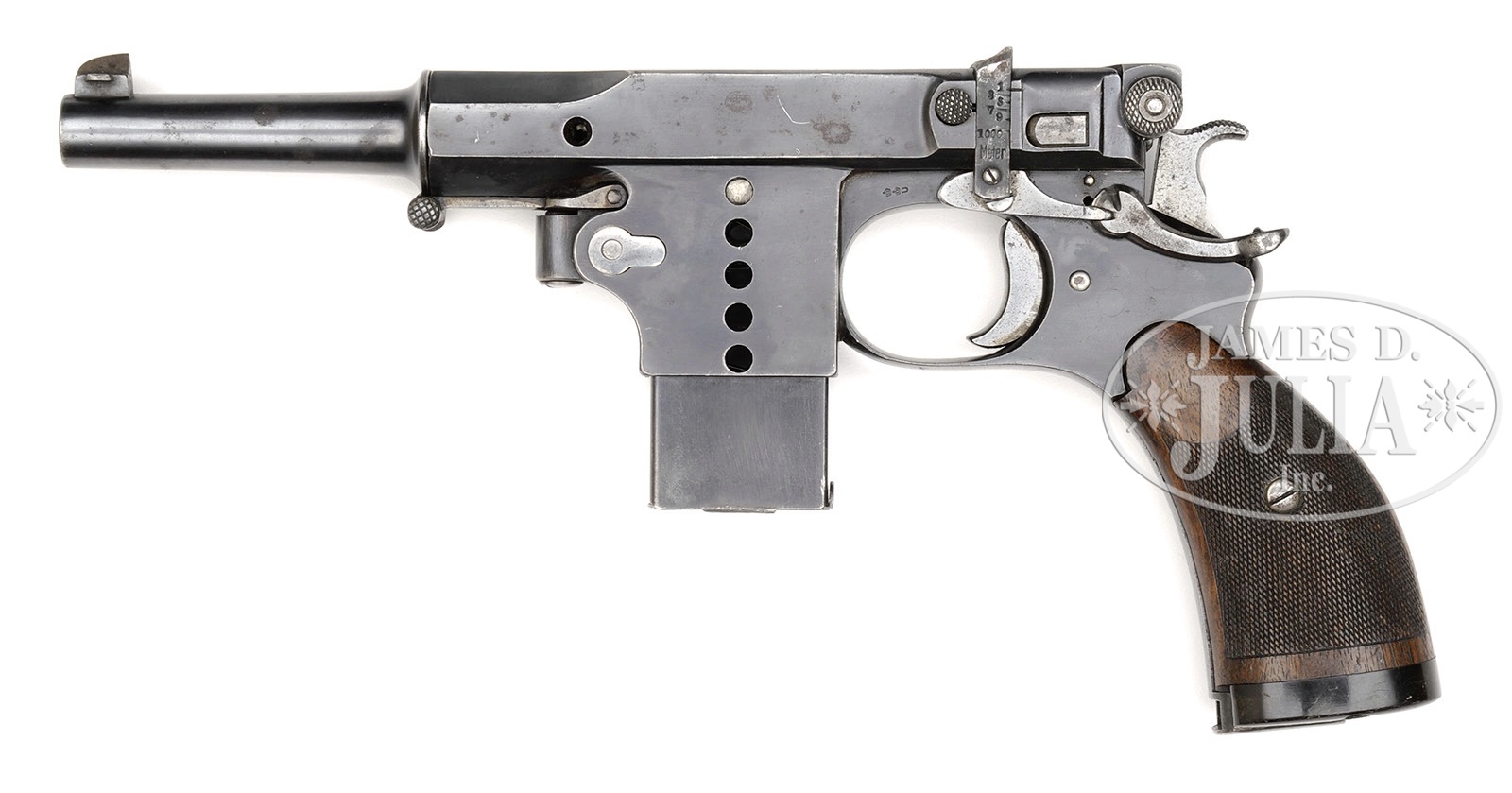 HIGHLY DESIRABLE BERGMANN M1897 WITH TARGET GRIPS.SN 96. Bergmann made approximately 1,000 M1897 pistols. This example has a 3″ bbl whose shroud is affixed with a drift adjustable front sight. The rear sight is graded from 100-1000 meters with gradations of 1,3,5,7,9,1000. As is typical for the numbered Bergmanns, a sliding cover is attached to the bolt and marked “PISTOLET BERGMANN/ PATENT BREVETE S.G.D.G.”. A Crown-U is marked on the left frame and on the back of the bolt while the serial number was applied to the right frame just above the cutout for the trigger guard. The magazine well has five indicator holes as is the corresponding extended magazine whose base is numbered. When manufactured, the hammer, safety stop, trigger, magazine release, and the bbl shroud stop lever were strawed while the extractor, rear sight, and safety were fire blued. Special finely-checkered walnut grips over a black hard vulcanized rubber base that reaches the bottom of the frame. PROVENANCE: Collection of Dr. Geoffrey Sturgess, ex-Dinely Collection, Illustrated TBLAP. CONDITION: 95% original rust blue. Comparable condition fire blue on the extractor with fading of the strawed take-down lever. The temper colors on all the other small parts have faded to a gray, excepting the rear sight whose oxidation and discoloration suggests replacement. Comparable condition grips with blunted checkering and scattered dings. No splits or losses. Bright, mirror bore with sharp rifling and minimal erosion. Although the bolt return spring is sluggish, the rest of the mechanics are perfect. 4-52211 LMA19 (12,500-17,500) – Lot 3030