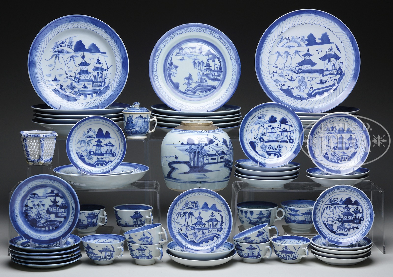 LARGE GROUP OF CANTON TABLEWARES.China, 19/20th c. The group includes a large amount of Canton blue and white export porcelain tablewares, including plates, cups, saucers, and other vessels, in the design of landscape and flowers. SIZE: Various. CONDITION: Good. 9-96292 (400-600) – Lot 3030