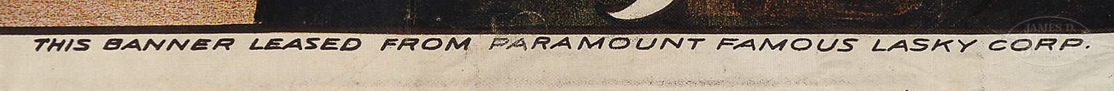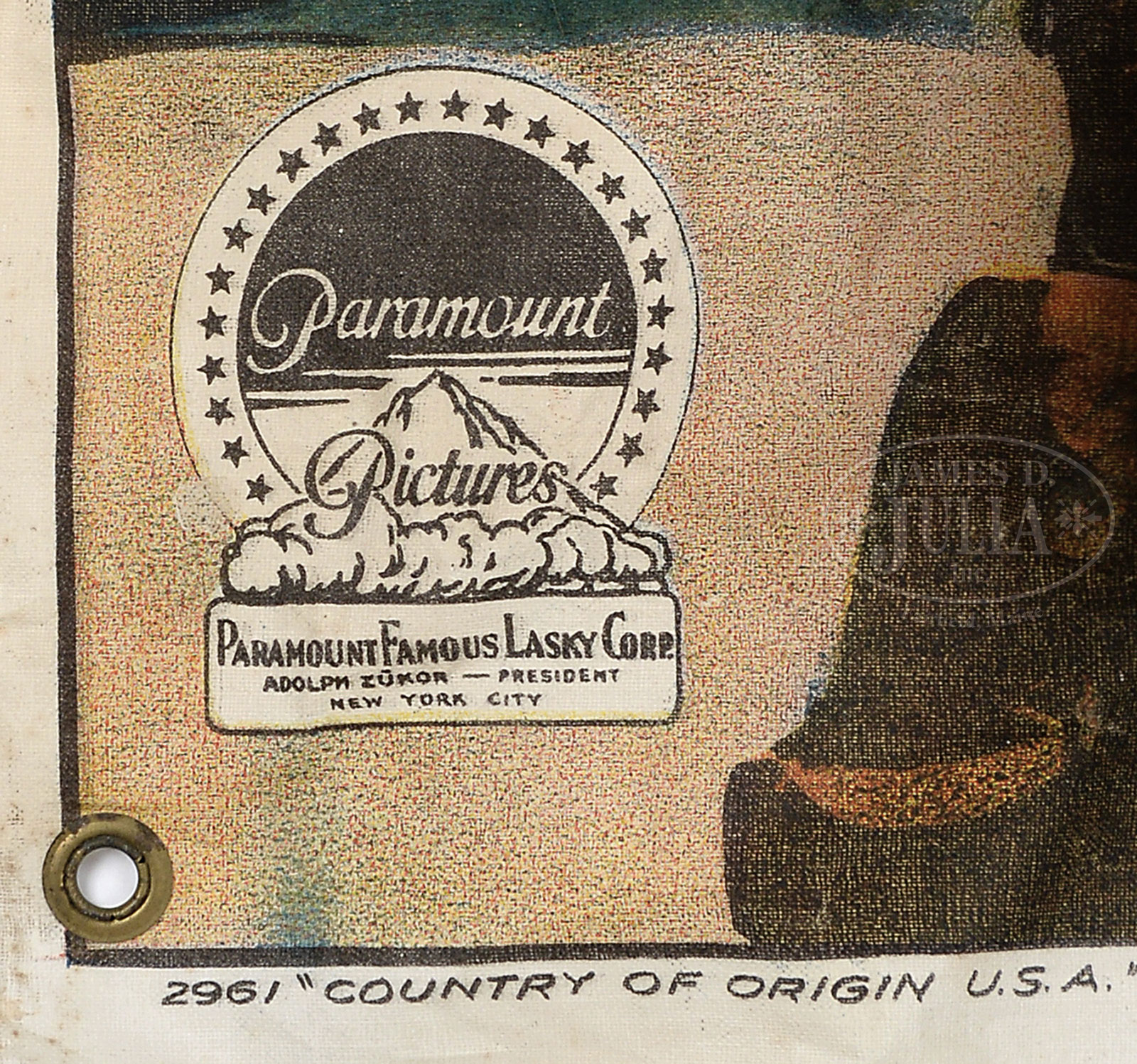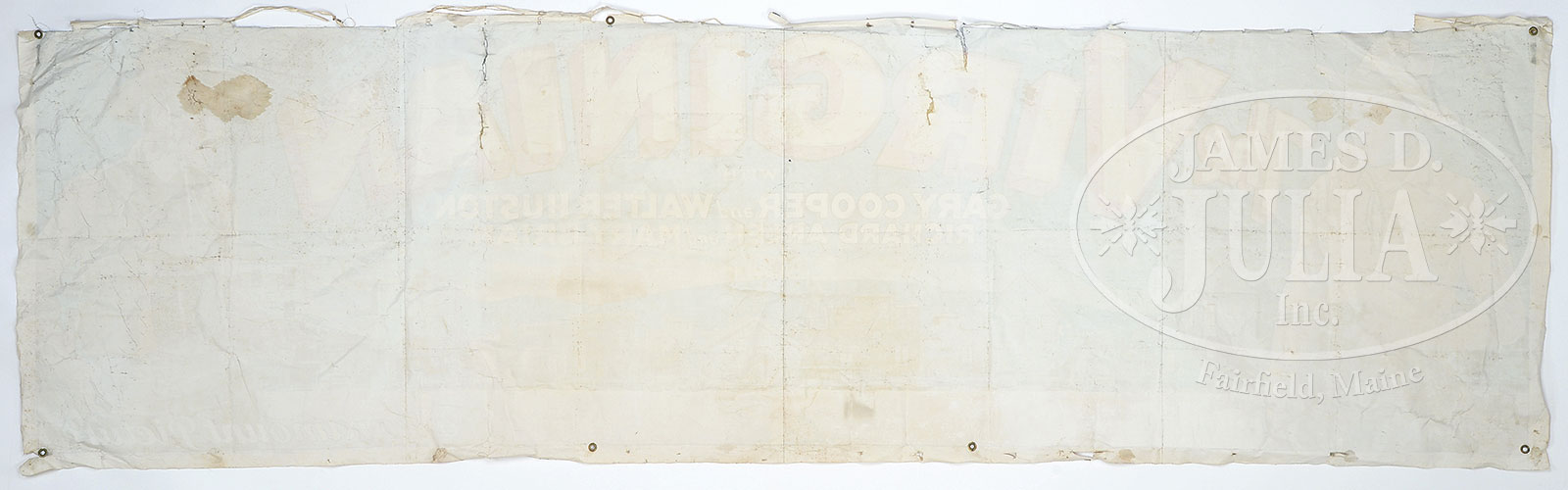 EXTREMELY RARE GARY COOPER MOVIE BANNER FOR THE “VIRGINIAN”.This is believed to be the only example known. Banners, in general, are significantly rarer than movie posters and this is an outstanding one. It was for what turned out to be a fine and popular Western movie which included a young Gary Cooper. This important movie purportedly elevated Cooper from strong leading man to a super star. This is his first talking movie and the movie actually appeared without sound and with sound; depending upon where it was played. The banner features fabulous bright colors and is a great rarity; one of cinemas most famous action heroes. The movie was produced by Paramount in 1929. SIZE: 118″ l x 35-1/2″ h. CONDITION: Some small losses & tears on margin (see image); some vertical fold creases, also a couple of small tears; colors remain strong. 52382-1 (3,000-8,000) – Lot 3031