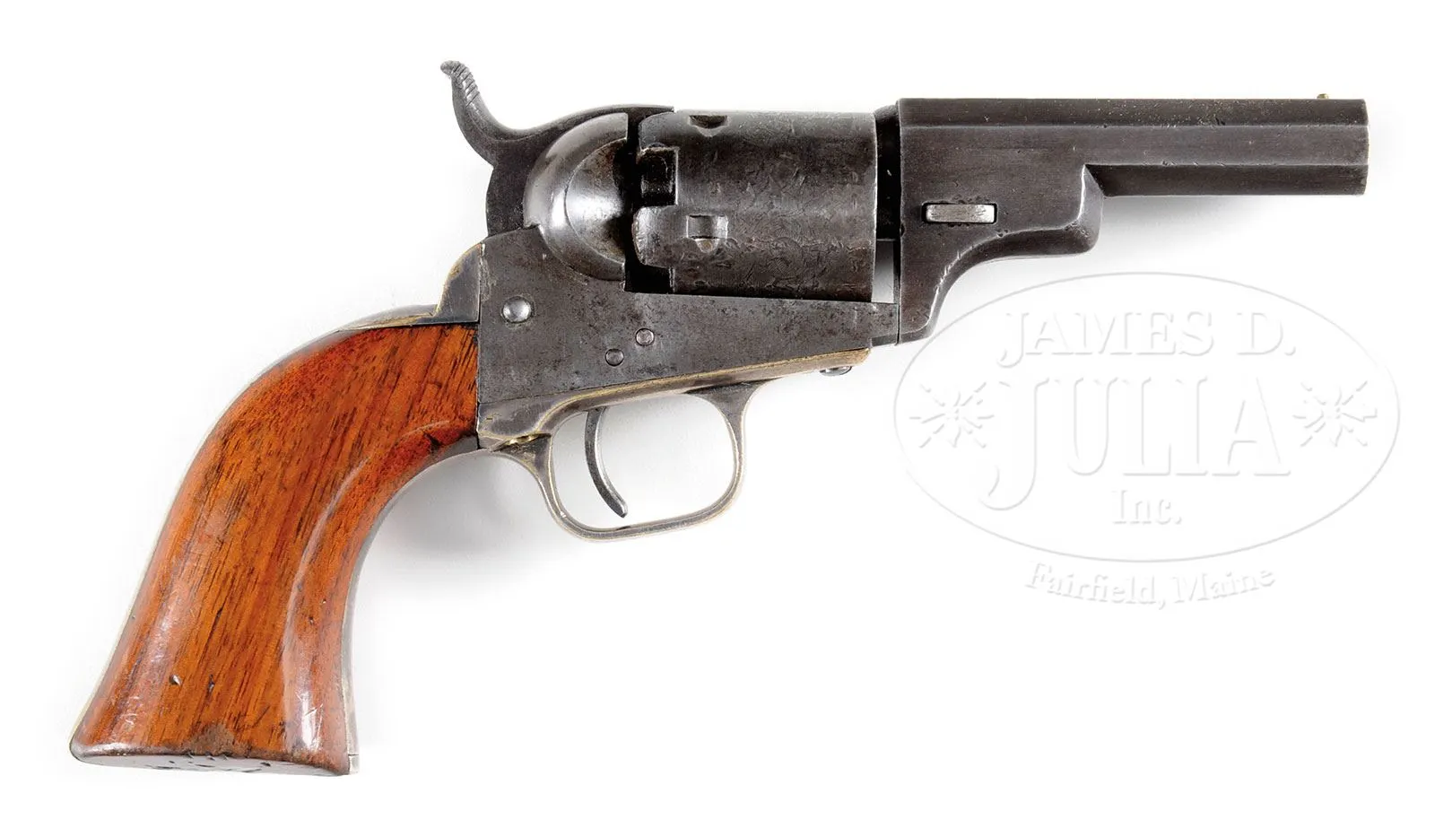 VERY RARE CASED SHORT FRAME COLT WELLS FARGO MODEL 1849 POCKET PERCUSSION REVOLVER.SN 55650. Cal. 31. Very rare short frame Wells Fargo ’49 with 3″ oct bbl, brass pin front sight and 2-line New York City address with brackets. Bbl is made without rammer and is probably from left over Baby Dragoon parts. Left side of frame has a tiny “COLTS PATENT”. Cyl has stagecoach hold-up scene roll marking with five chambers. Cyl spindle is 2/-1/2″ with a cupped end for use as a loading tool and without grease grooves. The small guard silver plated brass trigger guard and backstrap contain a varnished 1-pc walnut grip with faintly visible, only under bright light, last four digits of matching SN. Accompanied by an extremely rare burgundy velvet lined Colt casing, compartmented in the bottom for the revolver, a small brass 2-sided eagle & stars flask, a brass 2-cavity “COLTS PATENT” mold without sprue cutter, an L-shaped nipple wrench, a lacquered tin of Eley’s caps and a functioning key. According to the book COLT’S POCKET ’49 IT’S EVOLUTION, Jordan & Watt, it is estimated that only about 2,200 short frame Wells Fargo revolvers were ever produced and fewer than twenty were cased. The chart on p.63 of referenced publication shows that only an estimated 1,450 of the estimated 2,200 produced had long triggers as found on this revolver. PROVENANCE: Collection of John Montague. CONDITION: Fine, all matching including wedge, cyl & grip. Overall retains a smooth dark grey metal patina with traces of smoky case colors on the frame. Trigger guard & backstrap retains about 85% orig silver plating, strong on the front strap, thinning on the backstrap. Grip has a chipped left toe with battering on the bottom edges, showing light to moderate edge wear and retains most of its orig varnish. Mechanics are fine; strong bore with moderate pitting. Case has a grain check in the lid and a couple in the bottom with light nicks & scratches and retains most of its orig varnish; interior is heavily faded with light soil and spots of staining in the lid lining and heavily soiled in the bottom; partitions are solid; flask retains traces of orig finish being mostly a smooth brass patina; mold shows draw filed body with evidence of battering, inside & out; nipple wrench, probably a more modern replacement, is very fine; cap tin is fine. All together a very rare and seldom encountered cased revolver. 4-53757 JR156 (3,000-5,000) – Lot 3032