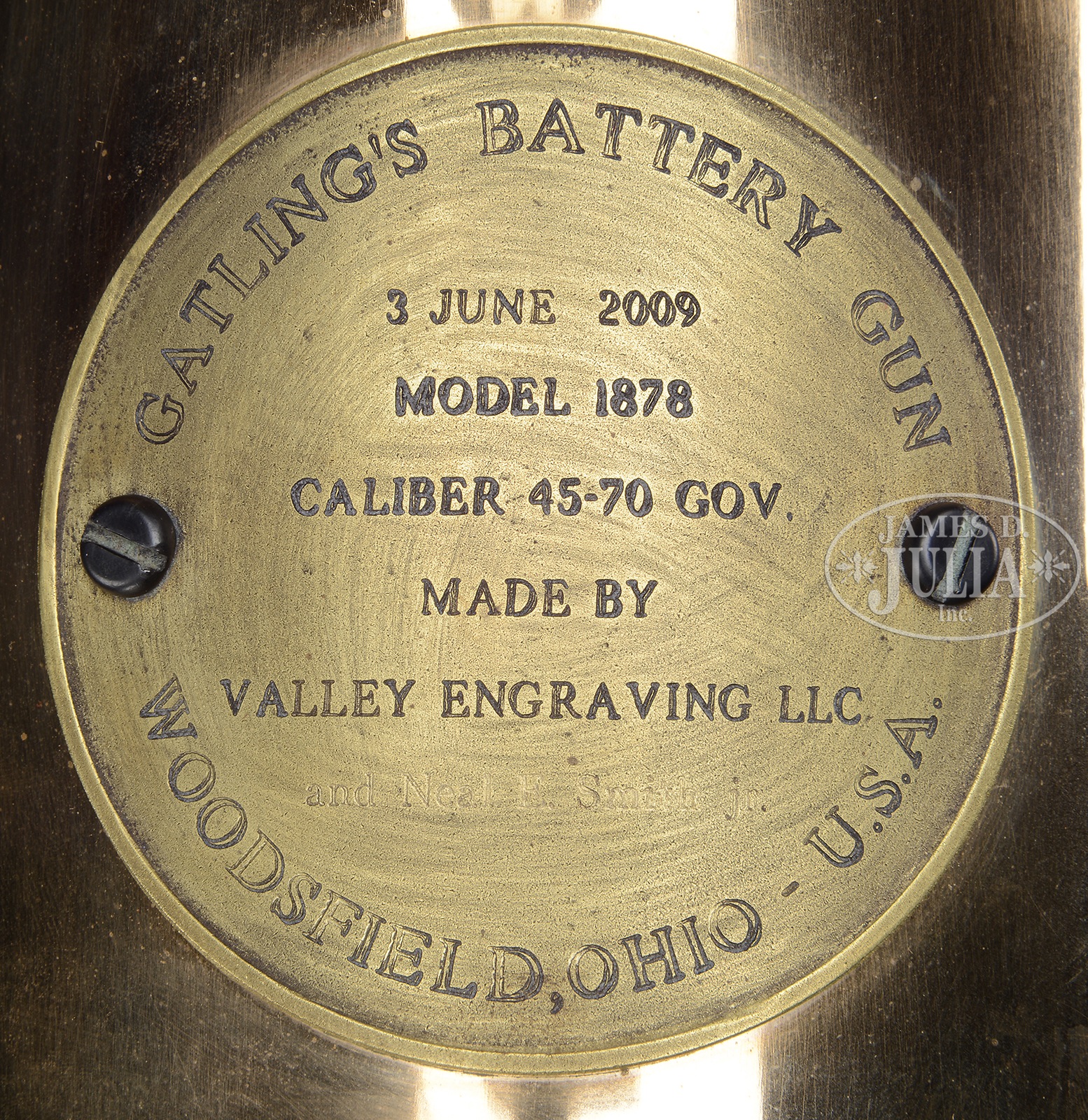 *FINE VALLEY ENGRAVING REPRODUCTION CAMEL GATLING GUN ON TRIPOD.SN 014-014. Cal. 45-70. Wonderful reproduction 10-barrel Gatling with 18″ bbl cluster mounted in orig type brass housing with steel frame. Trunnions are 1-1/4″ and the cascable is 2″. The articulated magazine base is for a Broadwell drum. Mounted in an iron yoke on iron furniture, all of which is mounted on an extraordinary reproduction oak and steel tripod. Top of the rear housing is fitted with a 3-1/2″ rnd plate bearing the manufacturers name & address, the date 3 June 2009, Model 1878, Caliber 45-70 Gov., made by Valley Engraving LLC and Neal E Smith Jr. Accompanied by 2 reproduction Broadwell drums, engraved on the top plate, “BROADWELL DRUM – CAPACITY 216 ROUNDS – CALIBER 45-70 GOV DATE OF MANUFACTURE 29 DEC. 2008” along with a line of Cyrillic writing. Both drums have brass and iron carrying handle on top. Few reproduction Gatling guns reach this level of sophistication or attention to detail. CONDITION: Extremely fine plus. Appears to be new and unfired. Tripod also appears to be new. 51100-2 (25,000-50,000) – Lot 3032