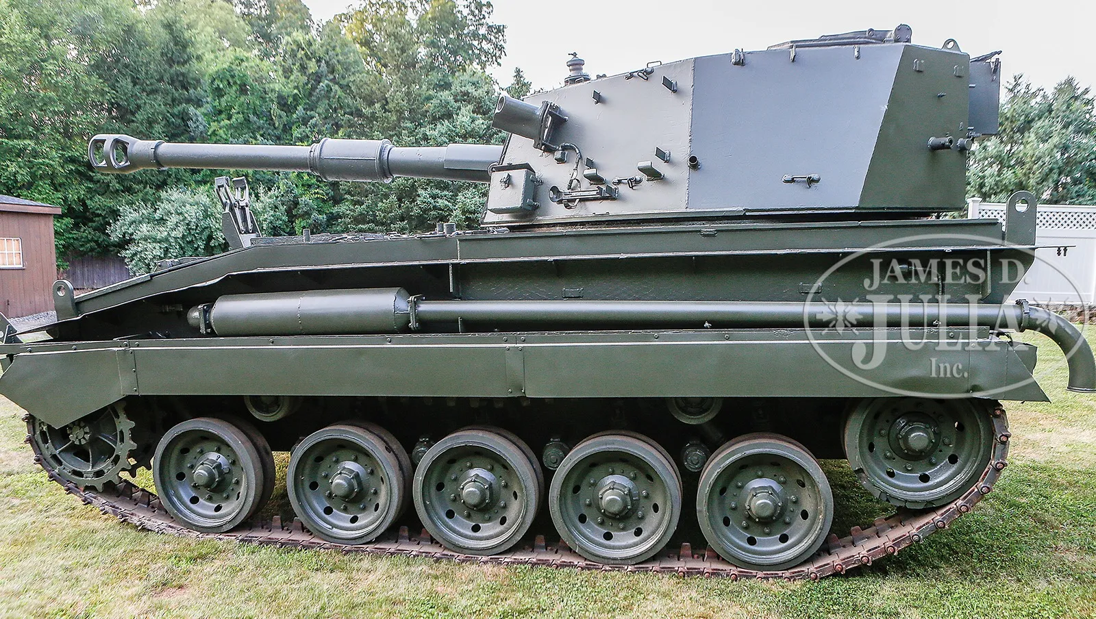 RECENTLY PAINTED AND POPULAR BRITISH ABBOT MODEL FV433 105MM SELF PROPELLED GUN IN TRACKED ARMORED CHASSIS.SN NSN. SN NSN. 105 MM cal. Although often called a “Tank”, the ABBOT FV443 is actually a tracked self-propelled howitzer in a fully rotating turret on an armored chassis. The Abbot was fielded by the British in 1965 and it’s intended role was to provide tactical support on the battlefield shooting in an in-direct fire role against anticipated invasion of western Europe by the Soviet Union. Built by the Vickers corporation, these vehicles were produced from 1965-1967 and remained in the British inventory until 1995. The turret rotates through a full 360 degree rotation and the gun will depress as low as -5 degrees and elevate as high as +70 degrees. The L13A1 105 MM gun is non function currently, but the ring and subsequent registration with the BATF are available completely separately from this auction through the consignor. Julia’s will put the winning bidder in touch with the consignor, but make no other warrantee whatsoever about the availability and transfer of the necessary parts to make the main gun live and registered. The engine is a Rolls-Royce K60 Mk 4G multi-fuel capable power plant which develops 240 horsepower at 3,750 RPM, and the vehicle can reach speeds up to 29 MPH, and can range as far as 300 miles with a 101 U.S. gallon (386 L) fuel tank. The Abbot does have a limited amphibious capacity when equipped with its flotation screen and can move at 3 MPH through water utilizing its own tracks. Parts are available and this model is still in service in some significant quantity with the army of India. The good suspension of this vehicle combined with modern engine and availability of maintenance parts make it a popular armored vehicle for enthusiasts which want to drive, or provide “tank” rides, as it looks tough, and has a traditional turret. Weight: 18.2-tons (16,556-kg); Length: 19′ 2″ (5.84-m); Width: 8′ 6″ (2.64-m); Height: 8′ 2″ (2.18-m) CONDITION: Engine is in good operating order, and exterior has been recently repainted. Turret revolves properly. Interior upholstery in good condition. This vehicle also has connection to Operation Desert Storm I according to consignor who has currently misplaced the maintenance record which substantiates this claim. When found this documentation will be provided to the winning bidder. 50961-3 JWK92 (75,000-150,000) – Lot 3033
