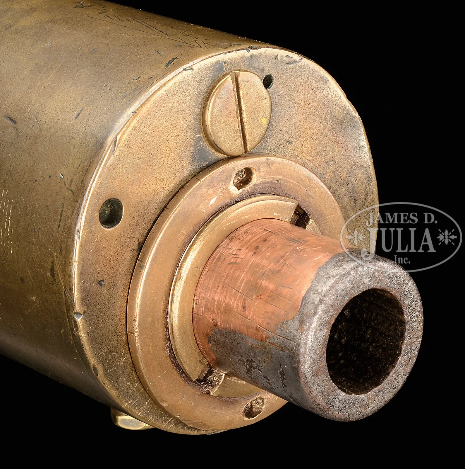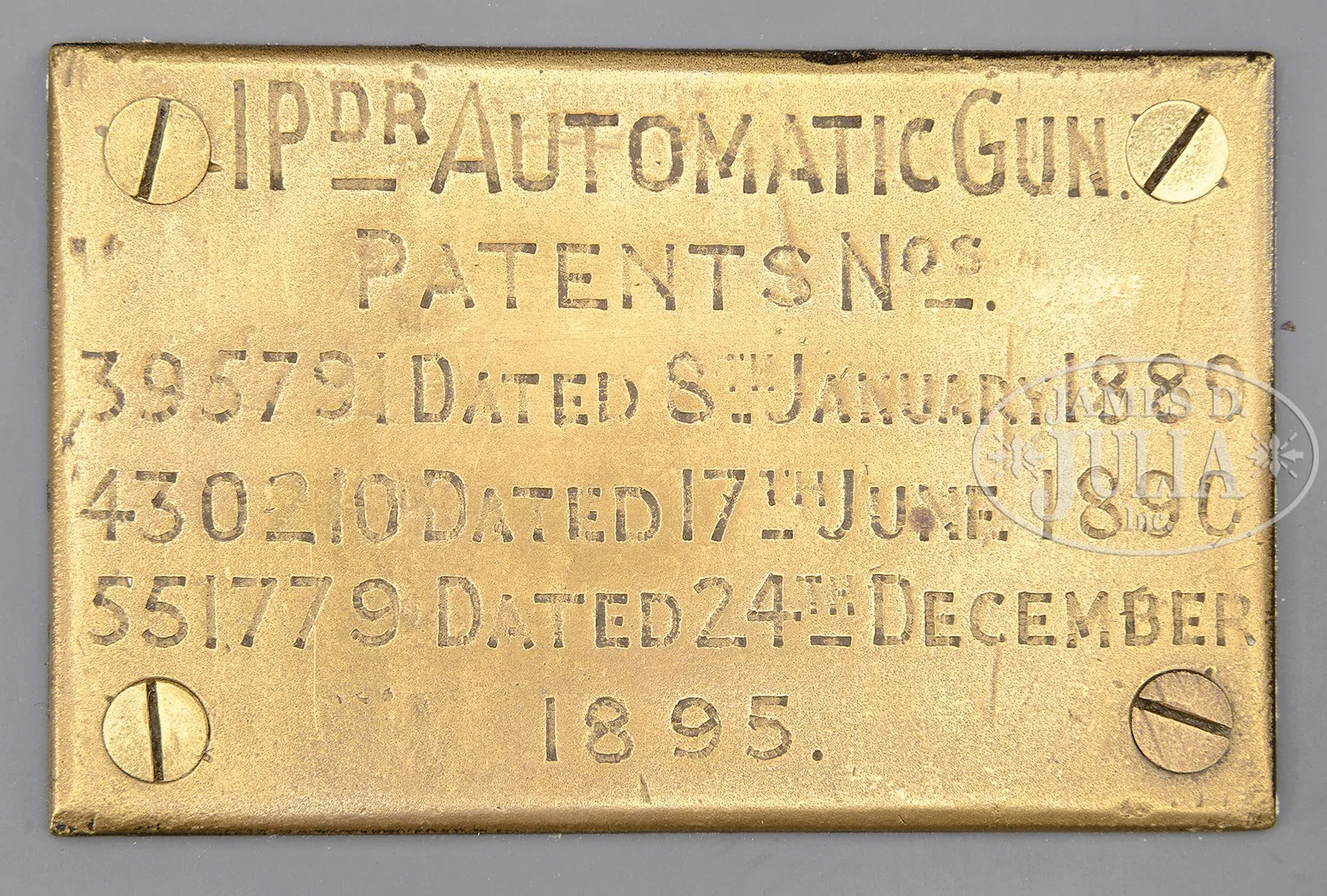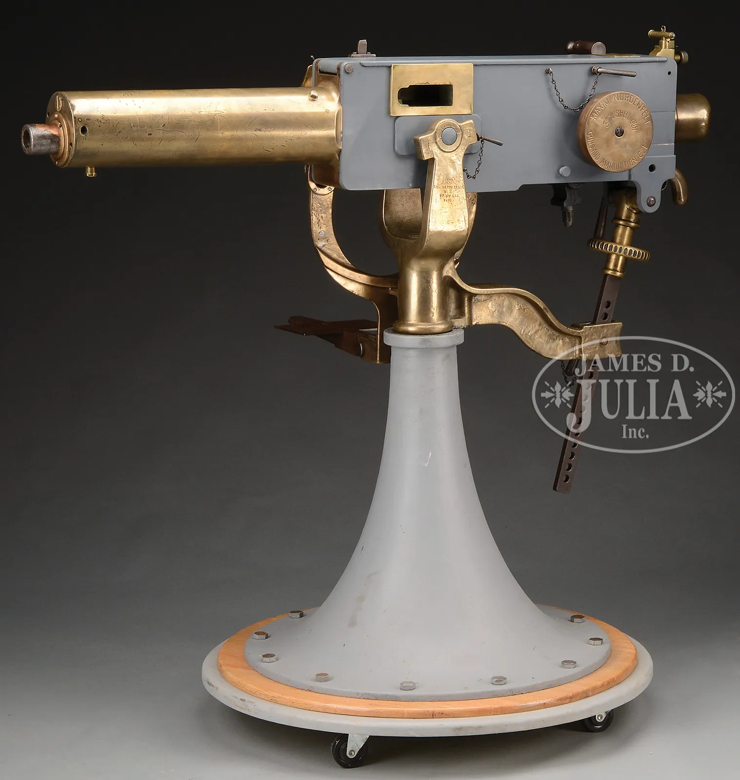HISTORICALLY IMPORTANT MAXIM NORDENFELT 37MM “POM-POM”, NAVAL DECK GUN (EXEMPT FROM NFA).SN 2024. Cal. 37mm. 51″ bbl. This exquisitely and professionally restored orig “one pounder” Maxim Nordenfelt automatic cannon is one of only very few extent of the early model. When found these are normally badly deteriorated having been exposed to the elements for decades, often as part of municipal historical monuments. This extraordinary specimen has the correct color gray paint covering the sideplates with a massive brass feed block incorporating an attractive wooden roller. It sets on an orig correct albeit non-matching SN Naval cone mount with brass cradle; the entire display piece is on a custom made wheeled dolly, making it manageable to move around. Actuating arm, feed slide, pawls and pins not present in feed block, nor is bolt present in receiver. Orig mainspring is included but not installed as the tabbed ends are not serviceable. Trigger bar, hand grip, cover, charging handle and external levers present and appear serviceable. Impressive orig brass spring cover also present on left side. Elevation adjustment wheel non-functional, however, steel pins and adjustable shaft allow one to display this piece pointing any number of positions of a wide vertical arc. Traverses smoothly through 360 degrees. This impressive display piece is non-functional due to missing the parts mentioned above and it is important to note that although this model is an automatic cannon with a rifled bore diameter greater than 1/2″ it has been declared “exempt” from the provisions of the National Firearms Act (NFA). A copy of a BATF letter attesting to this fact for this model is provided. This model is of significant historical interest as it was originally manufactured in 1889 as part of a thirty gun initial production run (This class of Maxim started at #2001). The first sale of gun #2024, with 5 others was made to the Minister of Marine, St Petersburg, Russia in March of 1895. All six guns were rejected due to defects and were returned to the factory and rebuilt. The top cover is marked with the issue/rebuild date of 1895. The company was reorganized in 1897 and conducted business as Vickers, Sons and Maxim (VSM), thus there are VSM inspection stamps on the gun. It is clear that the gun was sold, used, factory rebuilt and remarked before ourchase by the U.S. Navy in the first days of the Spanish American War. This gun was included in the first group of sixteen guns that the U.S. Navy purchased in March of 1898. This very gun, Navy Registery number 5, along with gun #2026 registry #6 were placed on the MANNING, a U.S. revenue Cutter, in April 1898, at Norfolk U.S. Navy Yard, according to the records of the U.S. Bureau of Ordnance. The Manning was taken into U.S. Naval service and participated in the bombardment of Spanish positions off Cabanas, Cuba on May 12th 1898. Eventually, Maxim 1 Pdr. Automatic Guns of this type were declared obsolete in the years 1911/1912 and were removed from ships during this period. PROVENANCE: RG 74 Records of the Bureau of Ordnance; Record of Armament of Naval Vessals, 1841-1903; Registry of Mounts for Secondary Battery, 1888-1913. Pgs 116 and 118-E131 CONDITION: Overall appearance and finish is absolutely outstanding as restored with the brass jacket exhibiting a pleasing patina with a commensurate finish on the brass feed block and other brass parts. Metal sideplate exhibit correct gray Navy paint. Orig brass spring housing simply outstanding. Trigger bar shows evidence of significant old pitting but is completely serviceable. Bore is moderately pitted but retains significant rifling. The “one pounder”, 1.457″ cartridge coupled with its manageable 250-300 rounds per minute rate of fire was extremely effective and could perforate a 1″ iron plate at 100 yards. Should a person be able to locate or fabricate the remaining parts, with the appropriate expertise, this gun could likely be restored to an operating condition. This cataloger is not aware of any source of orig solid steel projectile ammunition nor of a belt which would accommodate it, however, this specimen in this condition provides a unique opportunity for the advanced U.S. Military and Navy ordnance collector to acquire one of the most impressive and attractive pieces of Navy ordnance ever to come to public auction. The fact that records indicate it first went to Russia, and then later was in U.S. Naval Service during the Spanish American War make this a gun of noteworthy interest. 50927-1 JWK80 (150,000-250,000) – Lot 3034 Click here to view provenance