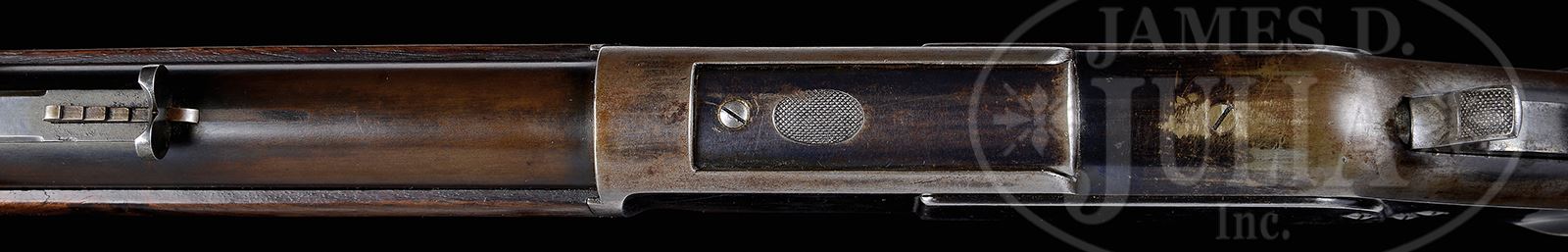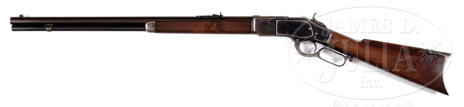 SCARCE WINCHESTER FIRST MODEL 1873 LEVER ACTION RIFLE.SN 21769. Cal. 44 WCF (44-40). Standard grade rifle with 24-1/4″ rnd bbl, full magazine, thinned half nickel orig front sight & early V-notch rear sight with checkered edges. Receiver is first type with mortised second type dust cover with impressed thumb print. Mounted with uncheckered straight grain American walnut with straight stock and crescent buttplate that has trap. Left side of lower tang, under the wood is marked with the assembly number 909 which number is also found in top tang channel of buttstock and inside toe of buttplate. These early 1873 arms were instantly successful and in great demand on the American frontier during the great Westward Migration of Manifest Destiny. The Model 1873 was the successor to the venerable Model 1866 and being chambered for the “New” center fire cartridges that were more powerful, reliable and re-loadable, made them an instant success. These rifles most often saw extreme hard service under adverse and harsh circumstances and those few remaining are seldom found with any orig finish. PROVENANCE: The Estate Collection of Phil A. Bleakney, Jr. CONDITION: Very good to fine, all matching. Bbl retains most of its orig finish turned to chocolate brown on the upper surfaces with strong blue in sheltered areas. Magazine tube retains about 75-80% strong orig blue with the balance also a chocolate brown. Receiver and side plates retain 60-70% thinning orig blue with the loss areas mostly a light patina. Top and bottom edges are a blue/brown patina. Hammer retains faded case colors with traces of case colors on the lever which is mostly turned silver. Forend cap and buttplate have also turned silver. Mechanics are fine, bright shiny bore. 49059-18 JR (4,500-7,500) – Lot 3035