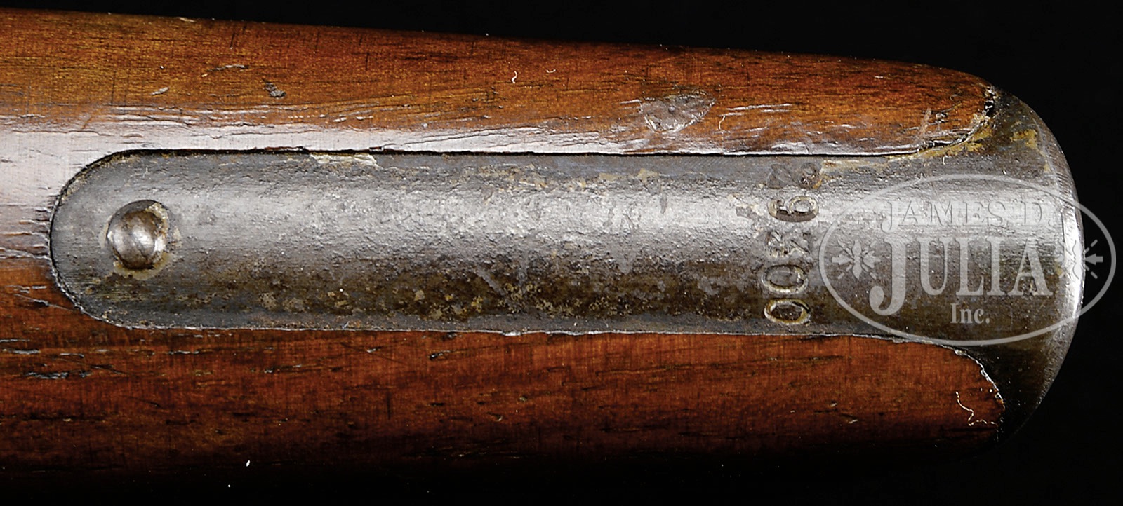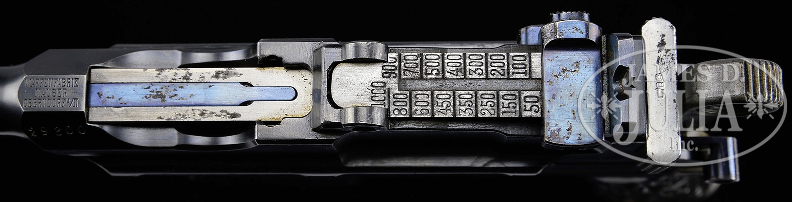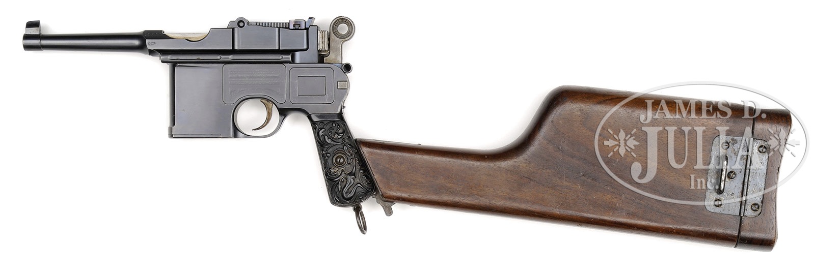 Please Note: The caliber is 30 Mauser not mentioned in the catalog. *◊ SCARCE MAUSER C96, PRE-WAR LARGE RING BOLO WITH FLORAL GRIPS AND MATCHING STOCK.SN 29300. Pre-war Large Ring Bolo with 4″ bbl, having fixed sight and slip-in 50-1000 rear sight. Bolt with long extractor and single lug firing pin. Usual address on top of chamber, Full SN on left chamber flat. Crown U marking on left side of bbl extension; antler proof on right side. Frame with standard 2-line address on right side. Small parts fire blued except trigger that is strawed. Hard rubber floral grips. Disassembly shows all matching numbers including the bbl extension, sight bar, bolt, bolt stop, hammer, subframe and associated components, frame, locking block, floorplate, follower and grip panels (hand inscribed with a “K” and the full SN). Lanyard ring present. Accompanied by orig factory matching stock. Exact pistol was mentioned in the Wesley Richards Register, page 70, copy provided by consignor, that shows this pistol as having been received on May 25, 1901 and sold to the Army and Navy Society on June 14, 1901. An exceptional Large Ring Pre-war Bolo rig with well documented provenance. PROVENANCE: Collection of Dr. Geoffrey Sturgess, Ex-Dinely Collection. CONDITION: 98-99% bright factory orig rust blue with congealed oil in the recesses around the bolt stop. Minor freckling on frontstrap. Wear on backstrap corresponds to stock attachment. Orig fire blue on extractor, cursor and bolt stop with freckled oxidative loss bringing condition to 90-93%. Comparable condition straw on trigger. Hard rubber grips with negligible handling wear. Mirror bright bore with sharp rifling. Perfect mechanics. Matching stock with most orig varnish and mildewed spotting. Single 3-1/2″ hairline crack extends along the lower spine. Hinge with lanyard loop has 80-90% orig temper blue with moderate oxidative spotting. Comparable condition lug whose upper arm is covered with congealed oil, likely responsible for much of the brown toning. 4-52082 LMA126 (6,500-9,500) – Lot 3040d
