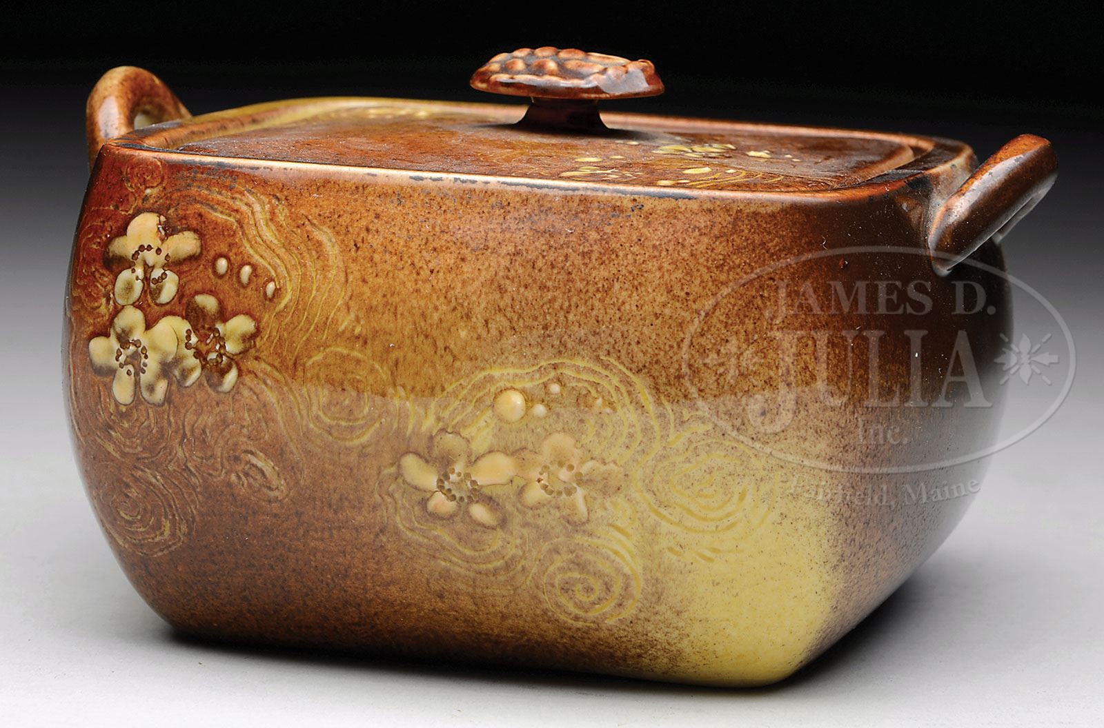 RARE ROOKWOOD POTTERY CANDY BOX, SHAPE 21. Circa 1887, Cincinnati, Ohio. With artist’s initials “A.V.B.” for Artus Van Briggle. the square box with fitted lid in mottled brown and yellow decorated overall with five petal flowers within incised foliate designs, the box applied with loop handles, the lid with scarab form knop, the base with incised markings of Rookwood Pottery with single flame above impressed mark “21C” for model and size, above an impressed “W7″, the maker’s initials scratched into the corner of the base. SIZE: 2-3/4″ h x 5″ l x 4-1/2” w. CONDITION: One handle has been reattached, otherwise good. 9-90934 (500-1,000)