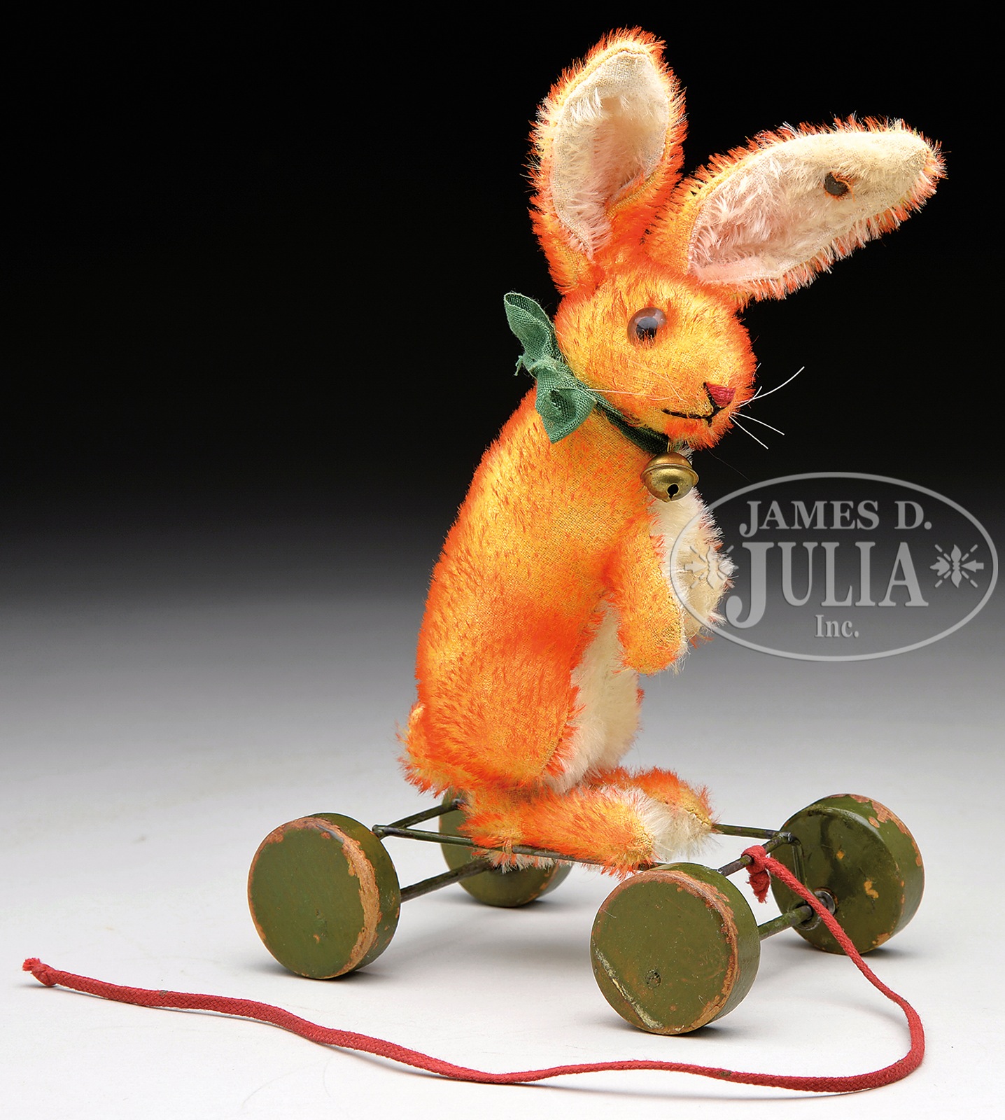 BRIGHT ORANGE MOHAIR STEIFF RABBIT WITH BUTTON ON WOODEN ECCENTRIC WHEELS.Rabbit is begging, head jointed and made from white and gloriously vibrant orange mohair. This color is not specifically mentioned in the standard Steiff Sortiment reference books for this item. The ears are lined in wire and are posable. Rabbit’s face is detailed with large black and brown glass pupil eyes and a red hand-embroidered nose and black mouth and clear monofilament whiskers. Bell appears original but ribbon is probable replacement. The white mohair lining of the rabbit’s ears are touched with a bit of pink airbrushed highlights. He rides upon four olive green wooden eccentric wheels, giving the appearance of the rabbit hopping as the cart is pulled along. Rabbit retains his long trailing “F” button and traces of his ear tag as his Steiff IDs. SIZE: 9″ t (23cm). PROVENANCE: Chuck & Cathy Steffes Collection. CONDITION: Light and general mohair loss and fading. Wooden wheels show paint losses, otherwise very good. 1-13876 (1,000-2,000) – Lot 3042 Auction: Advertising, Toy & Doll - Spring 2014 Please Note: All prices include the hammer price plus the buyer’s premium, which is paid by the buyer as part of the purchase price. The prices noted here after the auction are considered unofficial and do not become official until after the 46th day. |