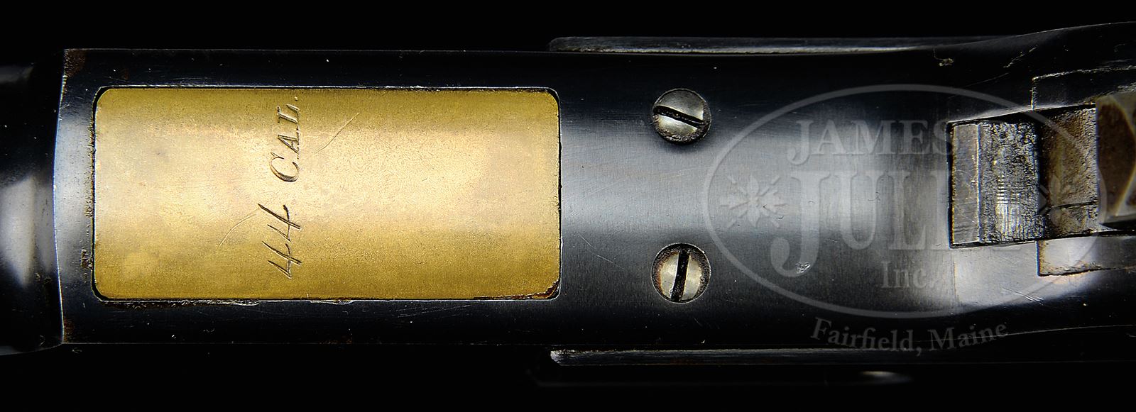 SN 571448. Cal. 44 WCF (44-40). Third Model Musket with 30″ rnd bbl, full magazine, square base front sight/bayonet lug and 900 yard musket ladder rear sight. Receiver is third type with integral dust cover rail and third type dust cover. Mounted with uncheckered, nicely figured, straight grain American walnut with full length forearm, three bands and straight stock that has carbine/musket buttplate with trap. Accompanied by an orig triangular socket bayonet without scabbard. The third model was the highest production of the Model 1873. Total production for the 1873 was about 720,610 rifles, carbines and muskets in 4 different calibers. According to The Winchester Book, Madis, only about 5% of that total (about 36,000) were muskets. Winchester was unable to generate any U.S. Military contracts for the ’73 musket so most of the production was sold to fill foreign military orders. Sometime in the second half of the 20th century a large cache of these muskets was discovered in Nicaragua and returned to the U.S. still in their original crates. Given the limited production, muskets should be considered quite rare as most of the foreign orders have never returned to the U.S. CONDITION: Extremely fine. Overall retains about 98% crisp, orig factory blue with a small scrape on the right sideplate and 3 or 4 fine scratches on left sideplate. Lever and hammer retain brilliant case colors, lightly faded on lever finger loop. Buttplate also retains brilliant case colors, a little thin on the heel. Wood has 3 or 4 bruises on the buttstock, otherwise is completely sound and retains about all of its orig factory oil finish. Mechanics are crisp. Brilliant shiny bore. Appears to be new and unfired. Bayonet is fine with some light surface discoloration. 49432-20 JR C&R (5,500-7,500) – Lot 3045