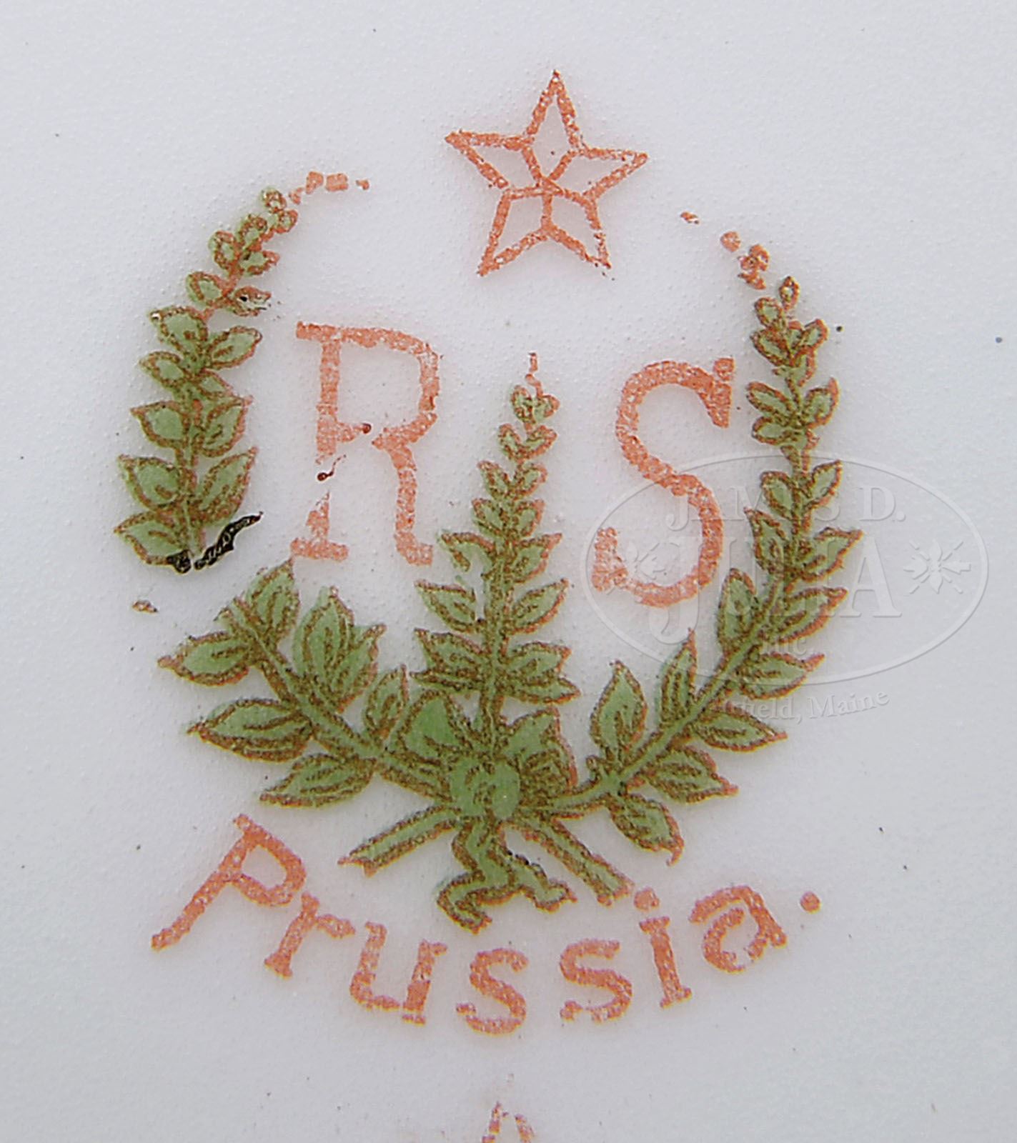 RARE ANTIQUE R.S. PRUSSIA COVERED CHOCOLATE POT DECORATED WITH TIGERS. Marked on base with red and green, “R.S. Prussia” mark circa 1880-1910. The lidded pot decorated with a standing tiger and a prone tiger with a pink setting sun sky and lush green jungle scene. The pot’s pouring rim having a collared spout (ice lip) to strain with. REFERENCE: P. 302, Plates 682 and 683, for same decoration (R.S. Prussia popular lines by Mary Frank Gaston). A rare and possibly unique pot. SIZE: 10″ h. CONDITION: Under blacklight the cover shows minor old restoration, pot is very good. 9-92150 (2,500-4,500)