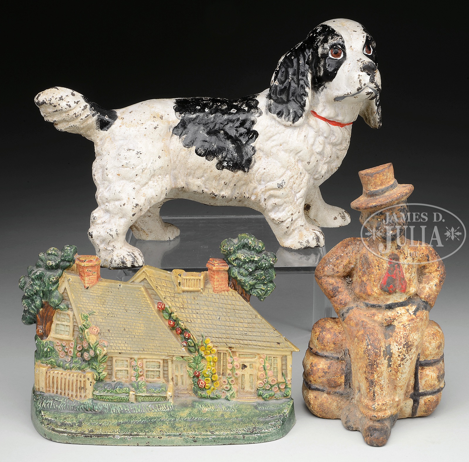 THREE CAST IRON FIGURAL DOOR STOPS.20th century, American, 1) Black and white figure of Spaniel dog attributed to Hubley (Hubley Manufacturing Co. Lancaster, PA); 2) English cottage with garden, attributed to Hubley (Hubley Manufacturing Co. Lancaster, PA); and 3) cast iron figure of man seated on cotton bale (probably late 20th century). SIZE: 1) 7″ h x 10-1/2″ l; 2) 5″ h; 3) 7-1/4″ h. CONDITION: 1) very good with minor nicks & paint wear; 2) very good with very minor wear; 3) well oxidized rust surface. 9-93780 (800-1,000) – Lot 3047