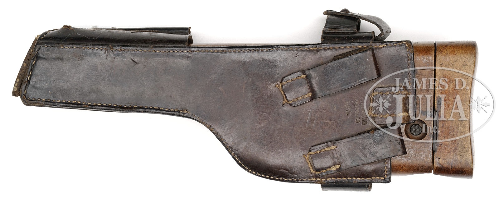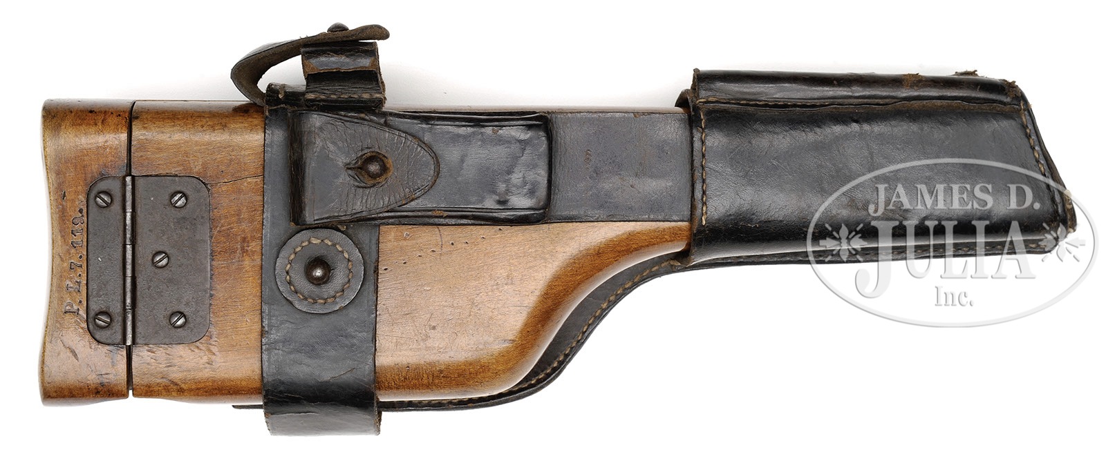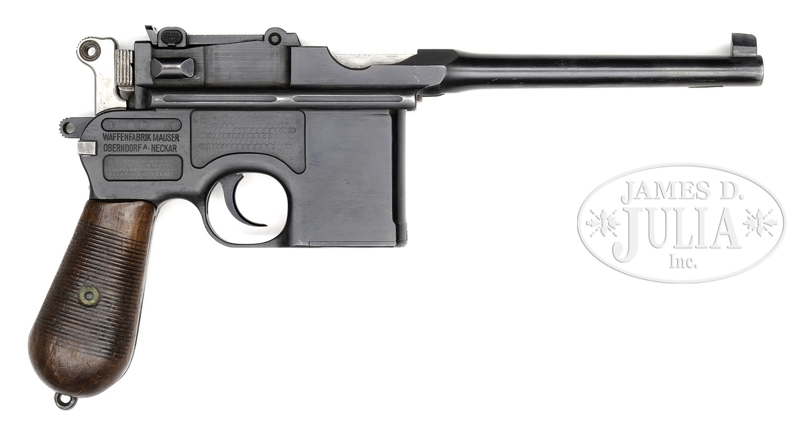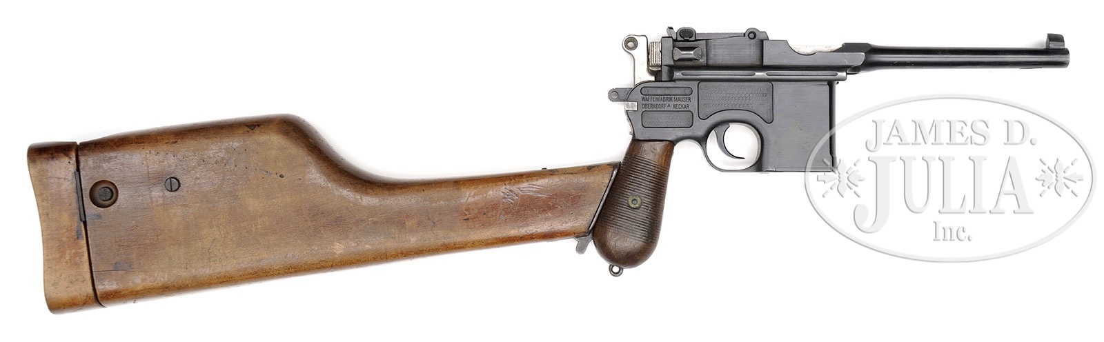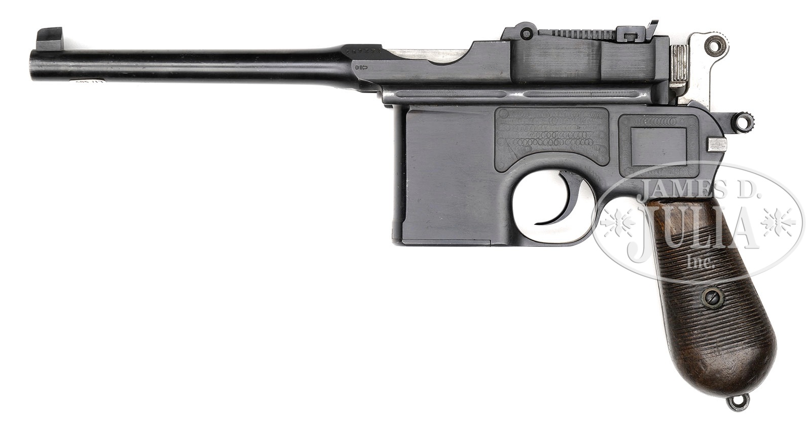 *◊ MAUSER C96 PRE-WAR COMMERCIAL, WITH MILITARY MARKING, STOCK AND CARRIER.SN 209251. Cal. 7.63mm. Standard Mauser Pre-War Commercial with 5-1/2″ bbl and slip in 50-1000 rear sight. Usual address on top of chamber. Full SN on left chamber flat. Small Crown U on left side of bbl extension; no marking on the right side. Standard 2-Line Mauser legend on the right side of the frame. The front strap is marked “F.M.G.Z.94.32.”. Disassembly shows all matching numbers or blank inspected parts as correct for the variation. Matching numbers include the bbl extension, bolt, bolt stop, hammer, subframe and associated components, frame, locking block, floorplate and grip panels. No lanyard ring. Complete with stock and carrier. The stock is of military configuration, having a hinge without a lanyard ring, and a lid that is marked “P.L.7119.”. The top of the lug has been ground to efface the previously applied numbers. Military carrier, the same as for a Red 9 pistol with provision for follower spring and cleaning rod. The obverse surface is marked “ESTELMANN STRASSBURG 1916.” PROVENANCE: Collection of Dr. Geoffrey Sturgess; Ex-Visser Collection. CONDITION: Refinished and salt blued with 98-99% of the reblue. Edges are generally sharp and milling marks easily discernible within the frame recesses. Unit markings on front strap are very easily legible. The extractor has 95-98% of its orig fire blue. All of the other heat tempered parts are now salt blued. The back of the bolt, and hammer have been polished. Orig grips with oil staining and moderate handling. The stock retains 50% of its orig finish, the rest having worn through to bare wood. There are several hairline cracks in the body, the largest two measuring 3-1/2″ and 3″. The hinge has turned brown and the lug has 50% fire blue in protected areas. The carrier is missing the strap that overrides the lid and there is no follower spring or cleaning rod. Some of the stitching is missing from the bottom whose end cap has nearly torn free from the body. 4-52119 LMA107 (2,000-2,500) – Lot 3048