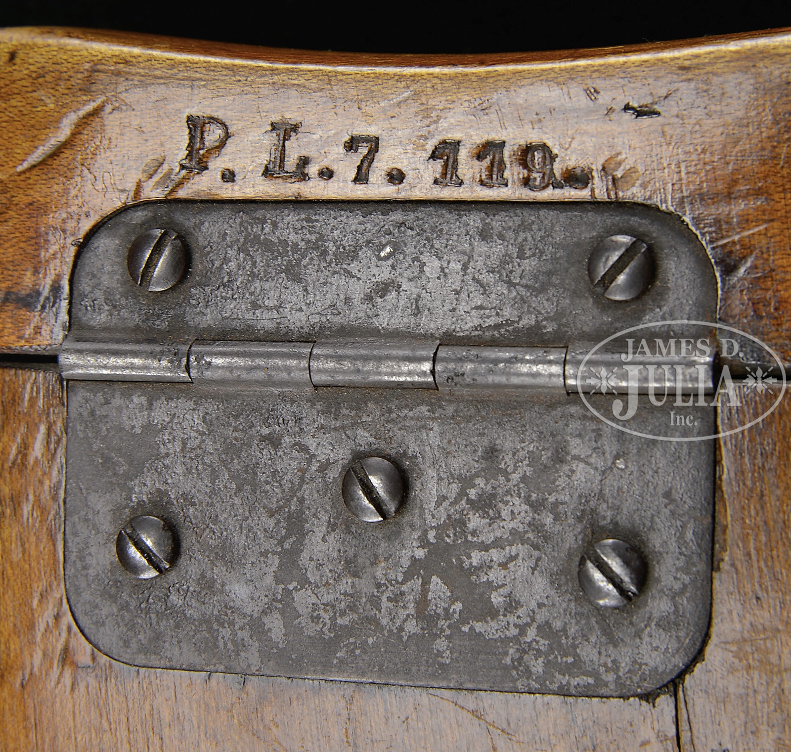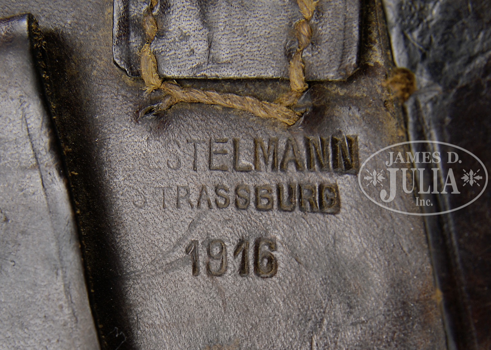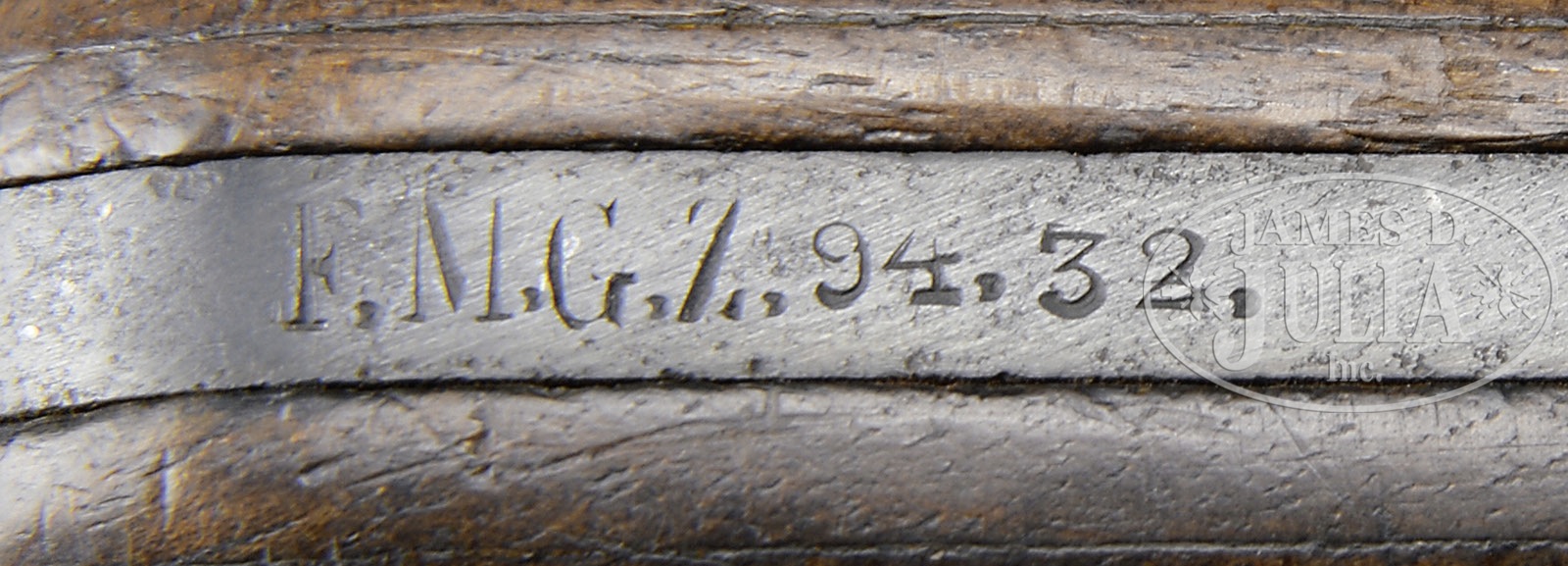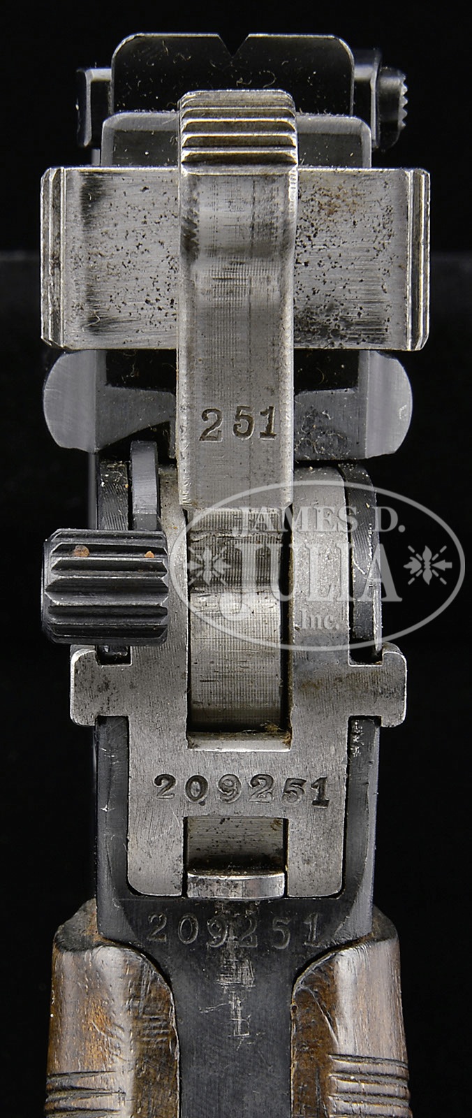 *◊ MAUSER C96 PRE-WAR COMMERCIAL, WITH MILITARY MARKING, STOCK AND CARRIER.SN 209251. Cal. 7.63mm. Standard Mauser Pre-War Commercial with 5-1/2″ bbl and slip in 50-1000 rear sight. Usual address on top of chamber. Full SN on left chamber flat. Small Crown U on left side of bbl extension; no marking on the right side. Standard 2-Line Mauser legend on the right side of the frame. The front strap is marked “F.M.G.Z.94.32.”. Disassembly shows all matching numbers or blank inspected parts as correct for the variation. Matching numbers include the bbl extension, bolt, bolt stop, hammer, subframe and associated components, frame, locking block, floorplate and grip panels. No lanyard ring. Complete with stock and carrier. The stock is of military configuration, having a hinge without a lanyard ring, and a lid that is marked “P.L.7119.”. The top of the lug has been ground to efface the previously applied numbers. Military carrier, the same as for a Red 9 pistol with provision for follower spring and cleaning rod. The obverse surface is marked “ESTELMANN STRASSBURG 1916.” PROVENANCE: Collection of Dr. Geoffrey Sturgess; Ex-Visser Collection. CONDITION: Refinished and salt blued with 98-99% of the reblue. Edges are generally sharp and milling marks easily discernible within the frame recesses. Unit markings on front strap are very easily legible. The extractor has 95-98% of its orig fire blue. All of the other heat tempered parts are now salt blued. The back of the bolt, and hammer have been polished. Orig grips with oil staining and moderate handling. The stock retains 50% of its orig finish, the rest having worn through to bare wood. There are several hairline cracks in the body, the largest two measuring 3-1/2″ and 3″. The hinge has turned brown and the lug has 50% fire blue in protected areas. The carrier is missing the strap that overrides the lid and there is no follower spring or cleaning rod. Some of the stitching is missing from the bottom whose end cap has nearly torn free from the body. 4-52119 LMA107 (2,000-2,500) – Lot 3048