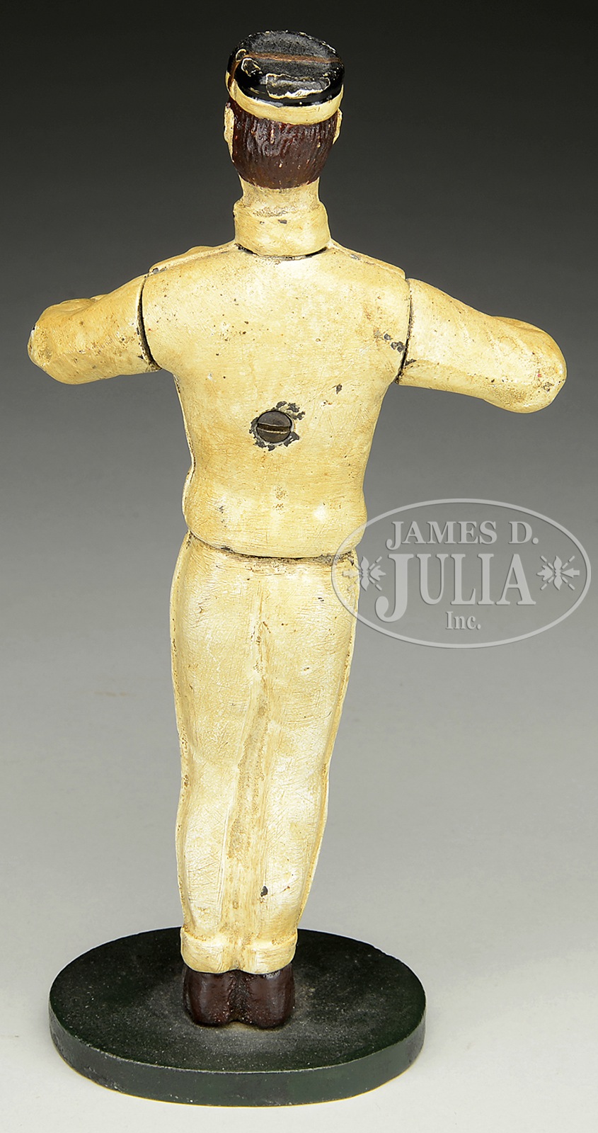 COCA-COLA WAITER DOORSTOP.1900 American. Full body two piece casting with attached base. Good casting detail. SIZE: 8-1/2″ h. CONDITION: Very good with nice age patina. Original paint, very minor paint abrasions, fine patina. Paint absent rear screw head, screw appears original. 9-93877 (800-1,200) – Lot 3048