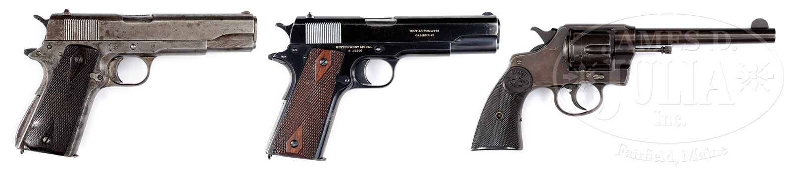 *LOT OF THREE COLT PATTERN HANDGUNS.1) KOREAN COPY 1911. SN 140. Cal. 45 ACP. Only slide markings are “LIVITANITL”, otherwise the slide bbl and receiver are internally marked with either a “G” or a “9” or a “6”. Mag appears to be a well used G.I. mag with considerable pitting and no finish. Walnut stocks appear to be heavily used G.I. double diamond. All other parts appear to have been workshop made. Pistol appears to function, but it is not recommended to fire the pistol without a gunsmiths compliance. Front sight appears to be a copy of the late 1911A1 sight with serrated rear ramp. Rear sight is also a copy of the late 1911A1 notched. PROVENANCE: The Frank H. Wheaton, III Collection. CONDITION: Bore is pitted but shows remains of rifling. Pistol appears to be in-the-white with no finish applied. Considerable surface deterioration. 2) COLT NEW ARMY & NAVY REVOLVER. SN 262565. Cal. .38 COLT. 6″ bbl, full blue finish, 2-pc checkered hard rubber grips with Colt medallions. Top of bbl shows Colt 2-line address and patent mark. Left side of bbl shows cal mark. Assembly NO. 1557 appears on the frame, in the crane mortise, on the crane opposite the mortise, on the lever latch, and scratched on the inside of both grips. SN is stamped on the butt at the toe. Frame has Rampant Colt logo in a circle stamped on left side above grip. Front left trigger guard bow shows “VP” proof, rear left trigger guard bow shows assembler number “3”. PROVENANCE: The Frank H. Wheaton, III Collection. CONDITION: Very good. Revolver shows a deep crusty blue/brown patina overall with evidence of slight re-finishing. Markings are sharp and unpolished. Bore is bright with sharp rifling. Hammer and trigger are a gray/brown patina and also show evidence of re-finish. Grips are very good, intact, with sharp checkering and clear logos. 3) COLT GOVT MODEL. SN 25260. Cal. 45 ACP. Right side slide marking “Colt Automatic Calibre 45”, left side has standard Colt 1913 last patent date marking and Colt’s Hartford address, Rampant Colt to the rear of serrations, left upper trigger guard bow has verified proof, lower trigger guard bow has “R” final inspector, right trigger guard bow is unmarked, behind slide stop pin is marked “Government Model” over “C25260”. Mag bottom marked “Colt .45 Auto”, fully blued welded base. Slide stop has 1911-type relief under thumb grip. Thumb safety is early type with milled area under thumb checkering, hammer is short wide checkered, grip safety has short tang, mainspring housing has lanyard loop. Front sight is thin-type with small dents, rear sight is thin “U” notch-type. Stocks are standard Colt double diamond. Bbl shows remains of “P” mark at front of ejection port. Slide stop has groove in rear. PROVENANCE: The Frank H. Wheaton, III Collection. CONDITION: Mag catch and mag catch lock very good. Front grip strap shows mild thinning of finish with partial finger print. Slide shows pitting from ejection port back on right side and thinning of finish on muzzle on both sides. Stocks show crisp checkering with only a few broken small diamonds, large diamonds crisp and clear. Stock screws in near excellent condition. Bore is shiny with some frosting in the chamber end. Mainspring housing is thinning. Overall very attractive, 95% of finish remains. 51517-10, 51517-15, 51517-118 (5,000-6,000) – Lot 3050
