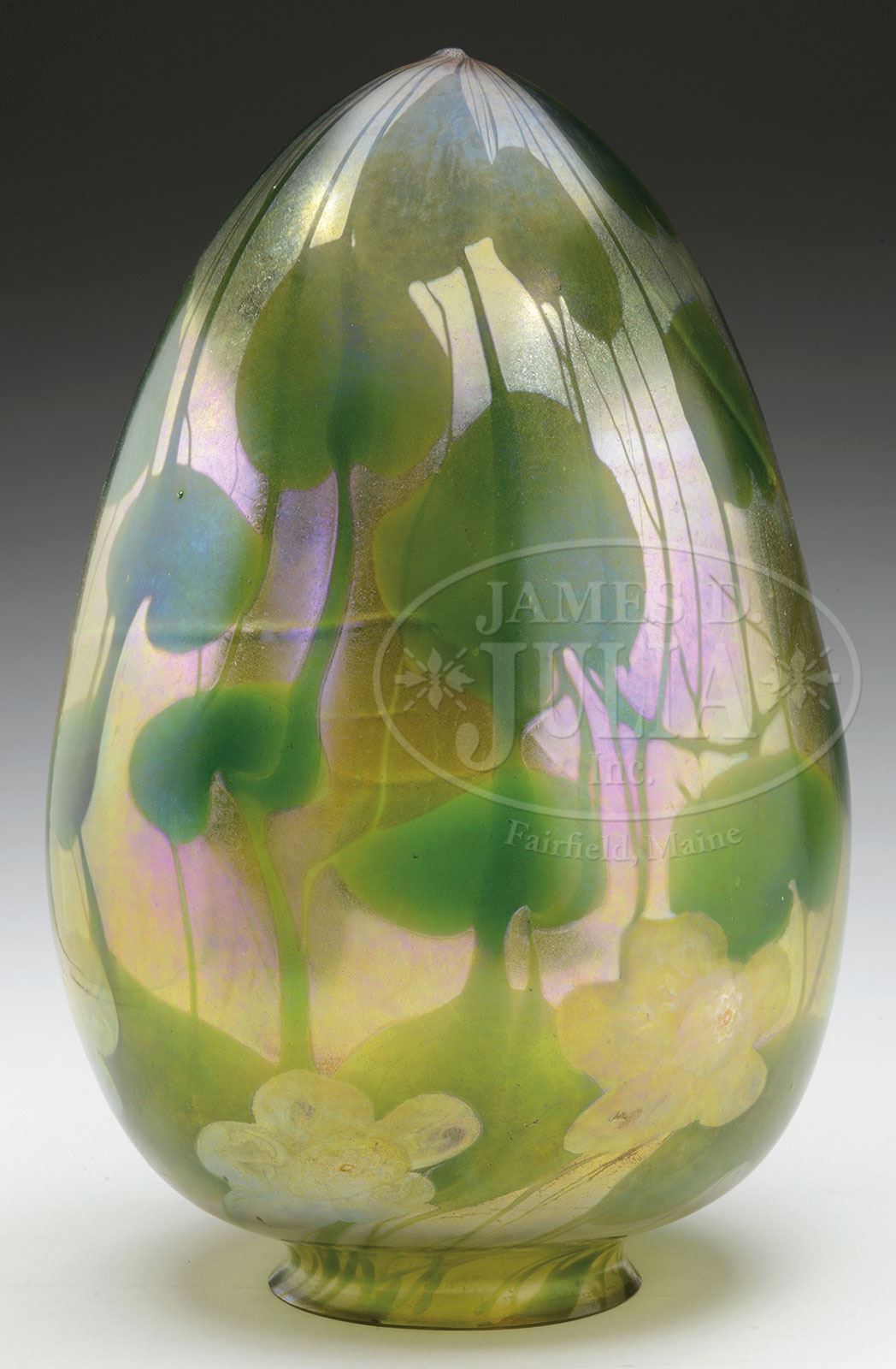 LARGE TIFFANY DECORATED BULLET SHADE.Very large Tiffany gold favrile bullet shade has green heart and vine decoration descending from the fitter to the bottom of the shade. Shoulder of the shade is decorated with a band of white millefiori inlays with gold iridescent flower petals surrounding the millefiori all set against a rich gold iridescent background with strong purple highlights. Signed on the fitter “L.C.T.”. SIZE: 13-1/2″ t x 8″ dia. CONDITION: Very good to excellent with some very minor roughness to the bottom tip of the shade (from the making). 5-69427 (13,000-16,000) – Lot 3052