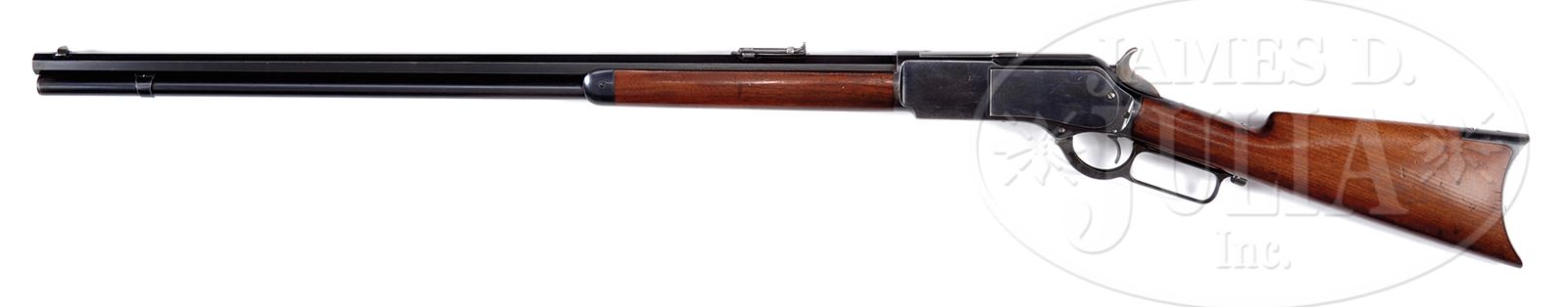 WINCHESTER MODEL 1876 SPECIAL ORDER LEVER ACTION RIFLE.SN 47655. Cal. .40-60. Standard grade rifle with scarce special order 30″ oct bbl, full magazine, half nickel front sight, and “1876” marked ladder rear sight. Mounted with uncheckered, straight grain American walnut with straight stock & crescent buttplate with trap. The Model 1876 is one of, if not, the lowest production of Winchester lever action rifles with only about 64,000 produced in the period 1876-1897. This model was the first big bore repeating rifle and as such was in great demand on the American frontier for its tremendous stopping power and rapid fire capability. It remained as a premiere long range big bore hunting & defense rifle until the advent of the Marlin Model 1881 & Winchester 1886, both of which were chambered for the more powerful, higher velocity cartridges, including the venerable 45-70. Those rifles were immediately successful, causing a drastic drop in demand for the heavier, more delicate Model 1876. This rifle was produced in about 1884 when the West was still wild and carrying & using a firearm was a daily way of life. Few of the firearms of that era are found today with high orig finish and special order pieces are especially rare. PROVENANCE: The Estate Collection of Phil A. Bleakney, Jr. CONDITION: Very fine plus. Bbl, magazine tube & forend cap retain 96-98% strong orig blue with only light sharp edge wear and a couple of tiny nicks in the sharp edges. Receiver retains about 95-97% orig blue showing slight dulling with sharp edge wear and some light candy-striping, mostly on right side. Hammer retains brilliant case colors and the lever strong, dark case colors on the sides, lightly to moderately faded on outer faces. Buttplate retains about 70-75% orig blue. Mechanics are crisp. Brilliant shiny bore shows very little use. 49059-23 JR (6,000-10,000) – Lot 3052