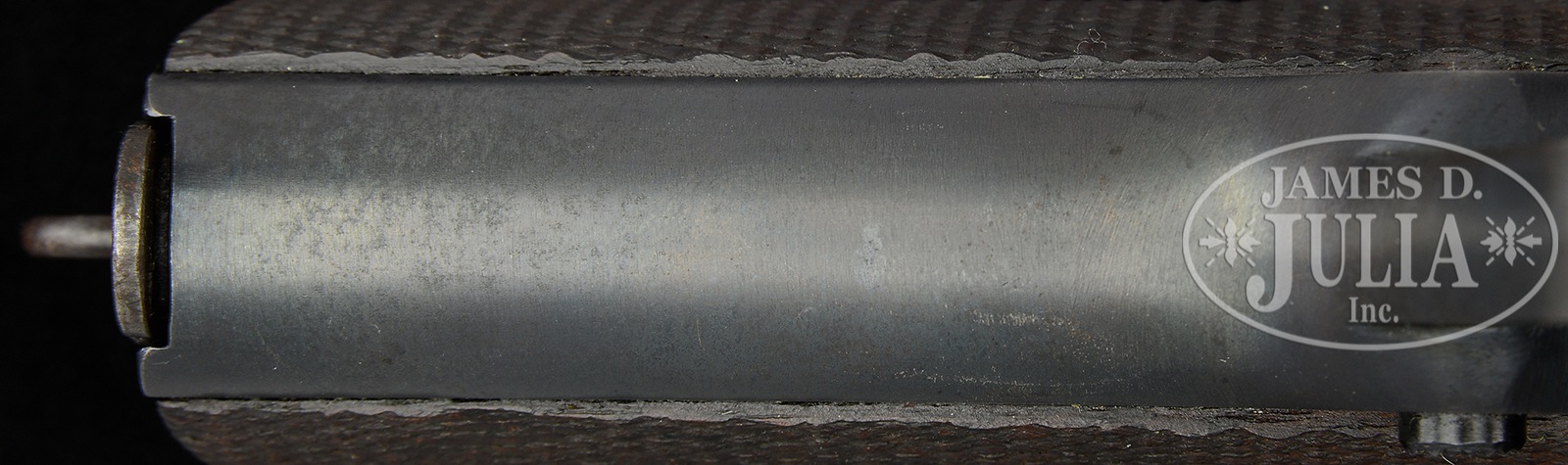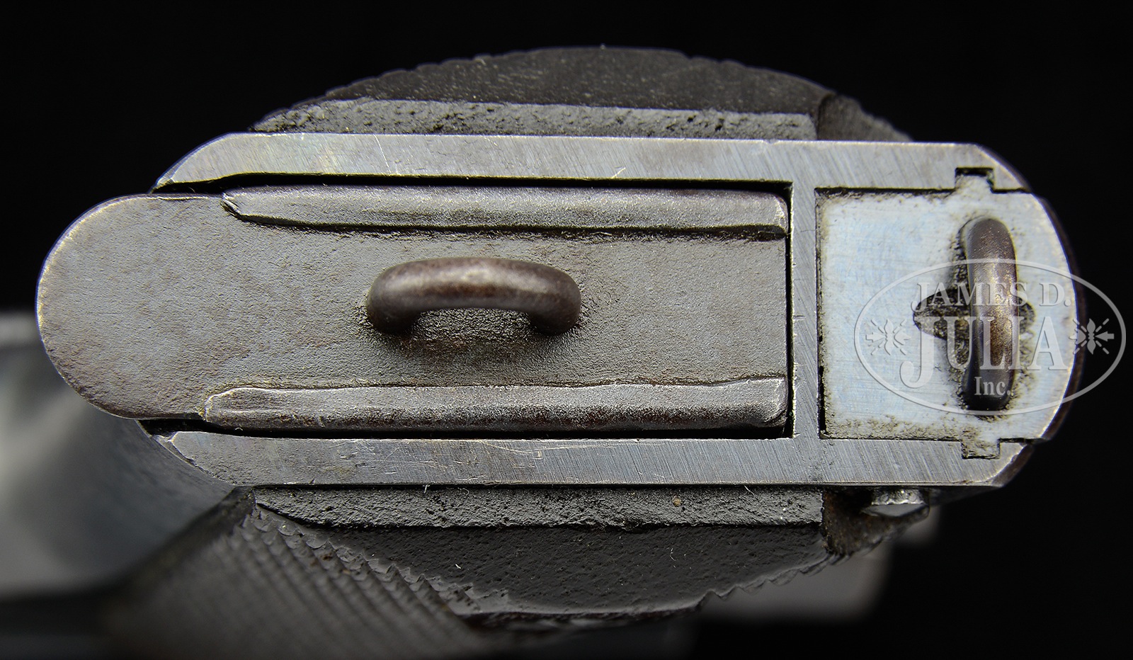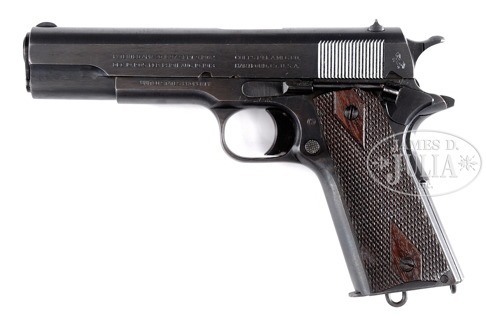 *EXCEPTIONAL COLT 1911 U.S. ARMY PISTOL SN 196905.SN 196905. Cal. 45. Colt 1911 U.S. Army pistol SN 196905 has orig blue finish on slide and receiver. Later Colt “C in Square” marked bbl. Magazine is a Springfield made folded bottom type with lanyard loop. 1917 made pistol showing very little wear. Colt patent markings on slide,”RAMPANT COLT”, “MODEL OF 1911 U.S. ARMY” all crisp and sharp. CONDITION: Bore is bright and shiny. Magazine catch lock slightly buggered, orig stock screws un-buggered. All proper markings, “SN 196905”, “United States Property”, “GHS” cartouche. All edges crisp and sharp. Slight thinning of front grip strap. Slight reddening of rear grip strap. Stocks sharp and crisp except a couple of small diamonds at the bottom. Only high edge wear. 94% finish. Left stock crushed in small area above lower stock screw. Overall, an exceptionally attractive 1911 with most of the orig finish and only a couple of changed parts. 50706-1 (4,000-6,000) C&R – Lot 3052