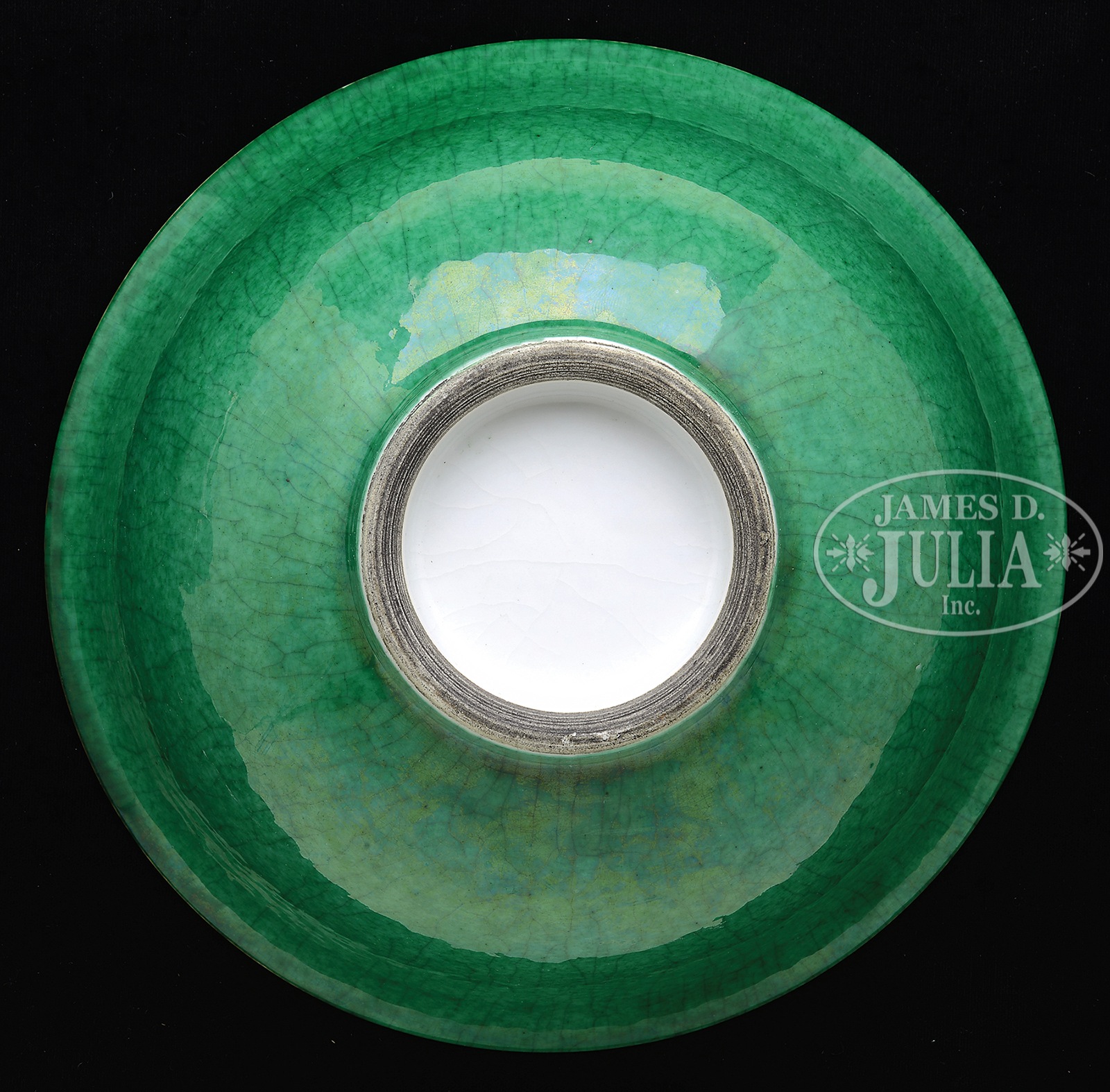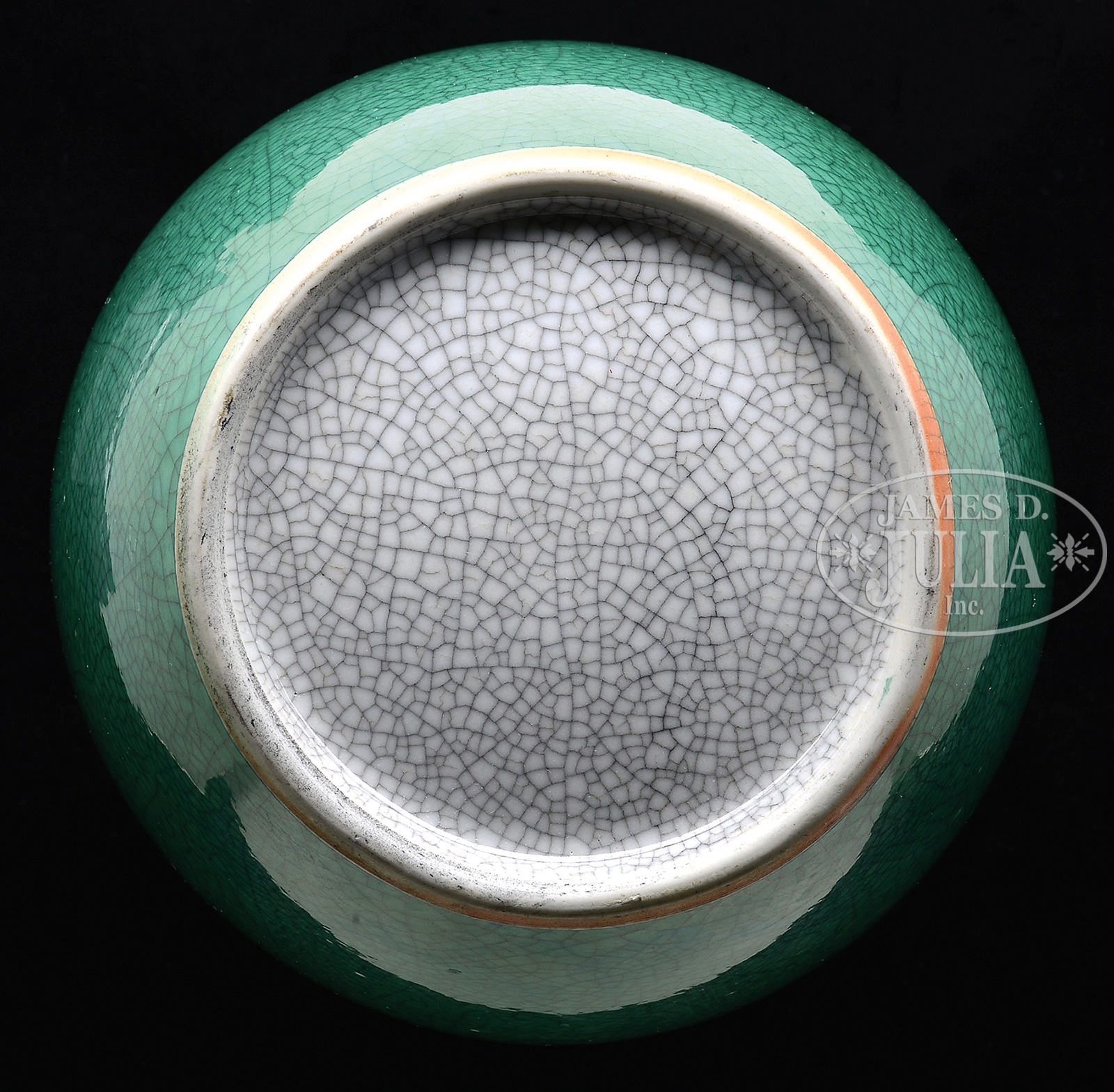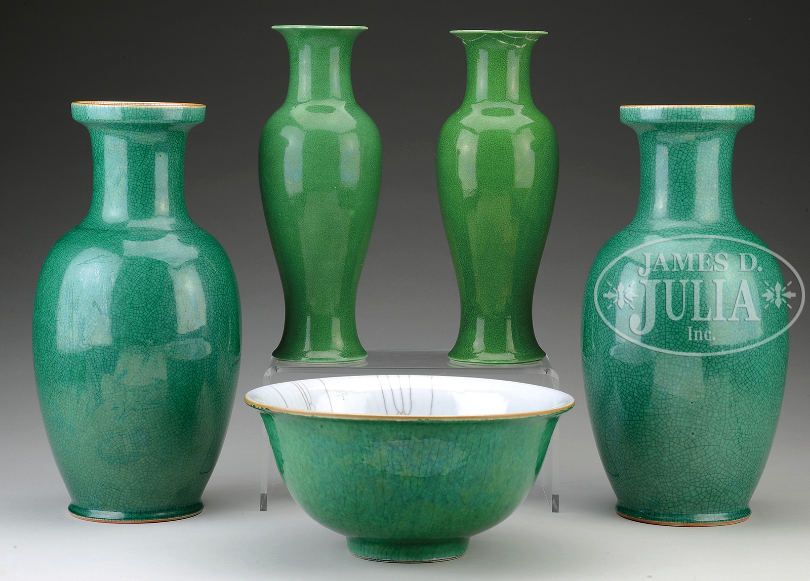 LOT OF APPLE GREEN GLAZED PORCELAIN.China, 19th/20th century. The lot consisting of two pairs of baluster form vases with apple green glaze having a light crackle finish along with a large footed bowl with similar apple green glaze standing on a rounded foot. SIZE: Taller vases: 13-1/4″ h. Shorter vases: 11-1/2″ h. Bowl: 10″ dia. CONDITION: One of the smaller vases with repaired rim, otherwise good. 49873-1 (800-1,000) – Lot 3053