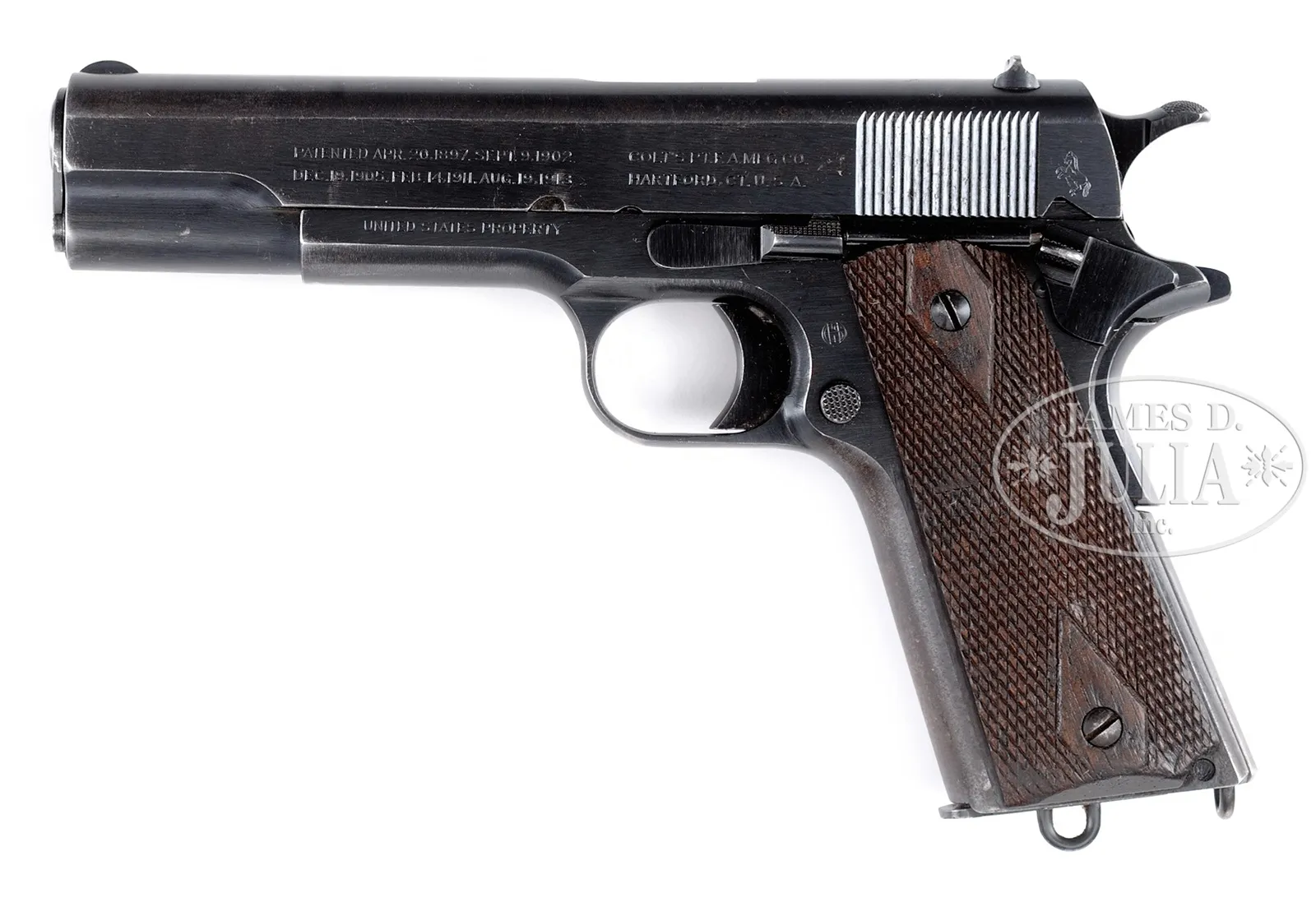 FINE 100 YEAR OLD 1911 COLT ARMY.SN 218705. Cal. 45. One of the last Gilbert H. Stewart inspected 1911’s. All proper markings “UNITED STATES PROPERTY” crisp and clear. “RAMPANT COLT” sharp. Sights in excellent condition. CONDITION: Stocks show moderate wear to the bottom portion. Some crushing of small diamonds on left side. Stock screws on right show minor buggering; stock screws on left look excellent. Excellent condition lanyard loop magazine not orig to pistol; LL stopped in 1916. “HP” sharing common leg inspected bbl is from a later pistol. Bore heavily frosted near chamber. All other parts appear correct and orig. Loss of finish on front and rear grip straps. Loss of finish to patina on top of slide. For a 100 year old “veteran” with a couple of changed parts, it’s in nice shape. 50835-2 KXK (3,000-6,000) C&R – Lot 3053