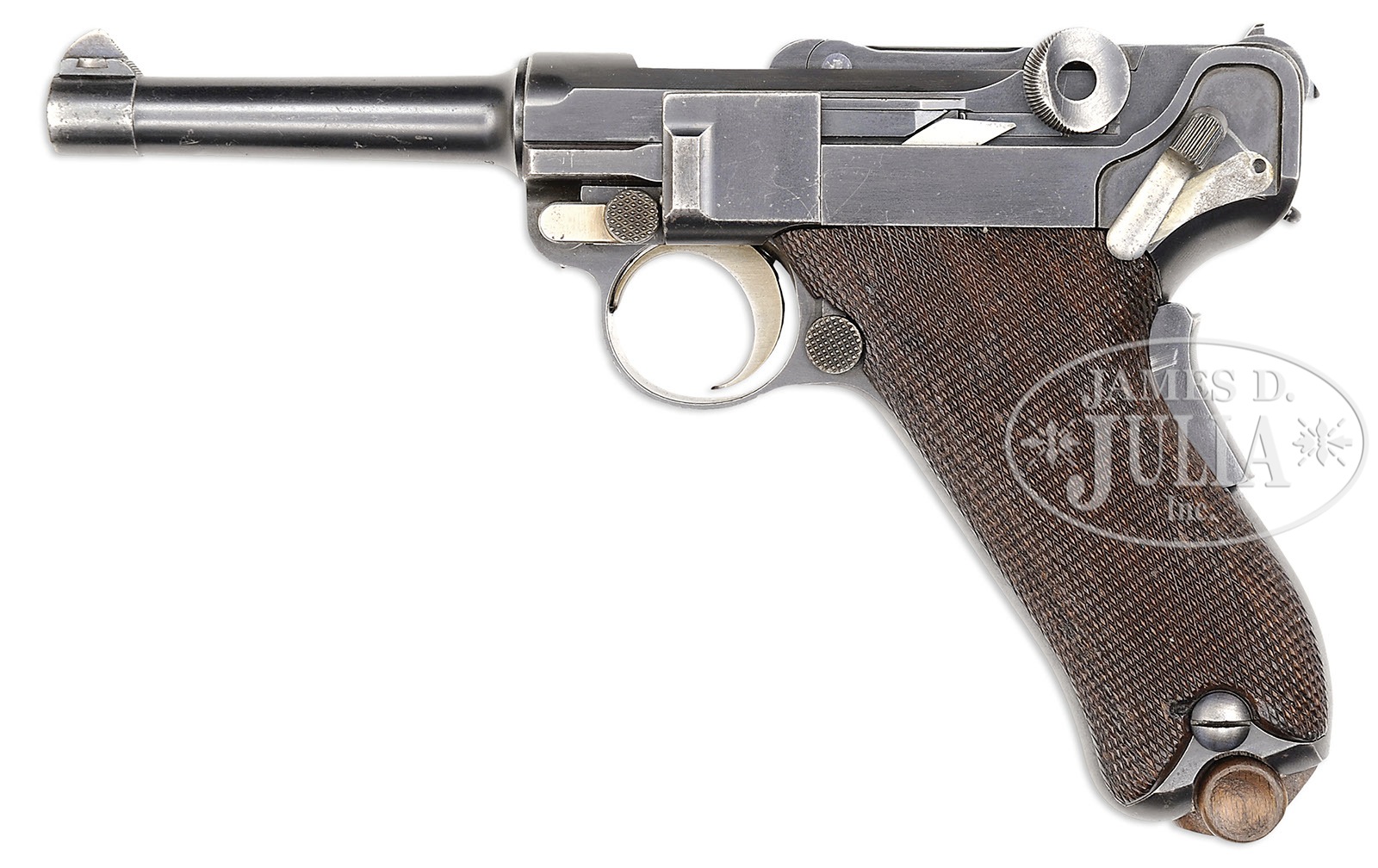 *◊ IMPORTANT DWM DUTCH TRIALS PROTOTYPE LUGER SERIAL NUMBER 10046B.SN 10046B. 4″ 7.65 mm Cal bbl of the distinctive prototype light military pattern with ramped foresight. DWM scroll on center toggle link. Dished toggles with toggle latch. Unmarked safety area. Grip safety. Unnumbered wood bottom magazine. All numbered parts are matching down to the checkered walnut grips. This is possibly the first surviving short frame prototype, which was converted from a long frame and is mechanically identical to the Dutch 1904 trials pistols, of which it is probably the internal factory prototype. This gun is featured on pp. 99, 101, 223, 225, 229 and 264 of The Borchardt & Luger Automatic Pistols by Joachim Gortz & Dr. Geoffrey Sturgess. PROVENANCE: Collection of Dr. Geoffrey Sturgess. CONDITION: Excellent. Retaining about 90% blue with silvering on sharp edges. Scattered scratches and fading on grip straps. Retains about 70% straw, some having been reheated. Bore is bright with light wear. Dark grips show some wood grain and have some dings and chips in the checkering. Magazine is excellent with very little wear. Mechanics are excellent. 4-52741 BWS8 (30,000-50,000) – Lot 3056