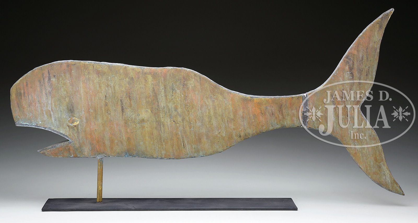 COPPER WHALE WEATHERVANE.American, late 20st century. Whale has verdigris patination. Accompanied by a museum type stand. SIZE: 14″ h x 39″ l. CONDITION: Good. 49105-8 (2,000-3,000) – Lot 3059