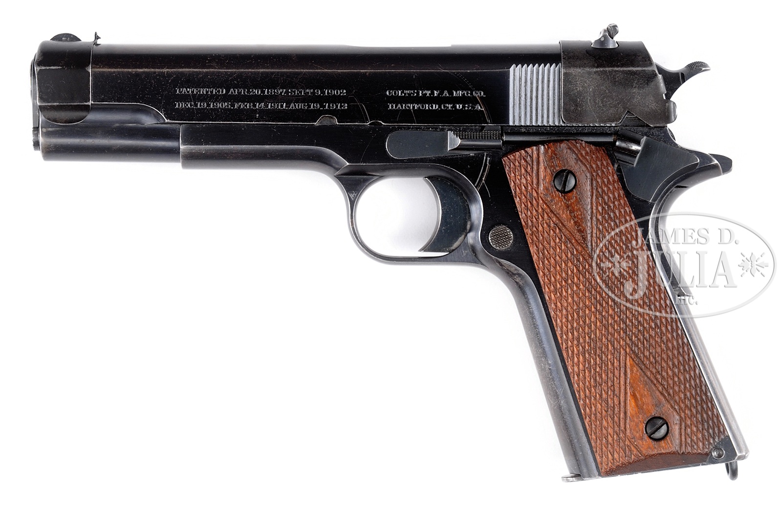 *VERY ATTRACTIVE COLT GOVERNMENT MODEL CIRCA 1914, SERIAL NUMBER C 14802.SN C14802. Cal. 45 . 1911 Government Model. Right side of slide marked “COLT AUTOMATIC CALIBRE 45”. Left side of slide marked standard Colt patent markings. Rear of slide under sight appliance “RAMPANT COLT” marking. Left trigger guard bow upper marked with verified proof; lower trigger guard marked “Y”. CONDITION: Bright high polished, orig finish on frame and slide. Slide stop, thumb safety, and grip safety show smoky blue finish. Fitted with clip-on wide notch front and rear sight appliances that appear to be easily removed. Probable replacement stock screws and stocks. Thinning of finish on front grip strap apparently from users ring. Rear grip strap, very, very nice. Bbl in the white through ejection port. Bright mirror bore. Standard two-tone magazine shows moderate wear and oxidation. Overall condition a very attractive 92%. 51033-73 KXK (3,000-5,000) C&R – Lot 3059 Click here to view provenance
