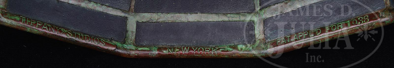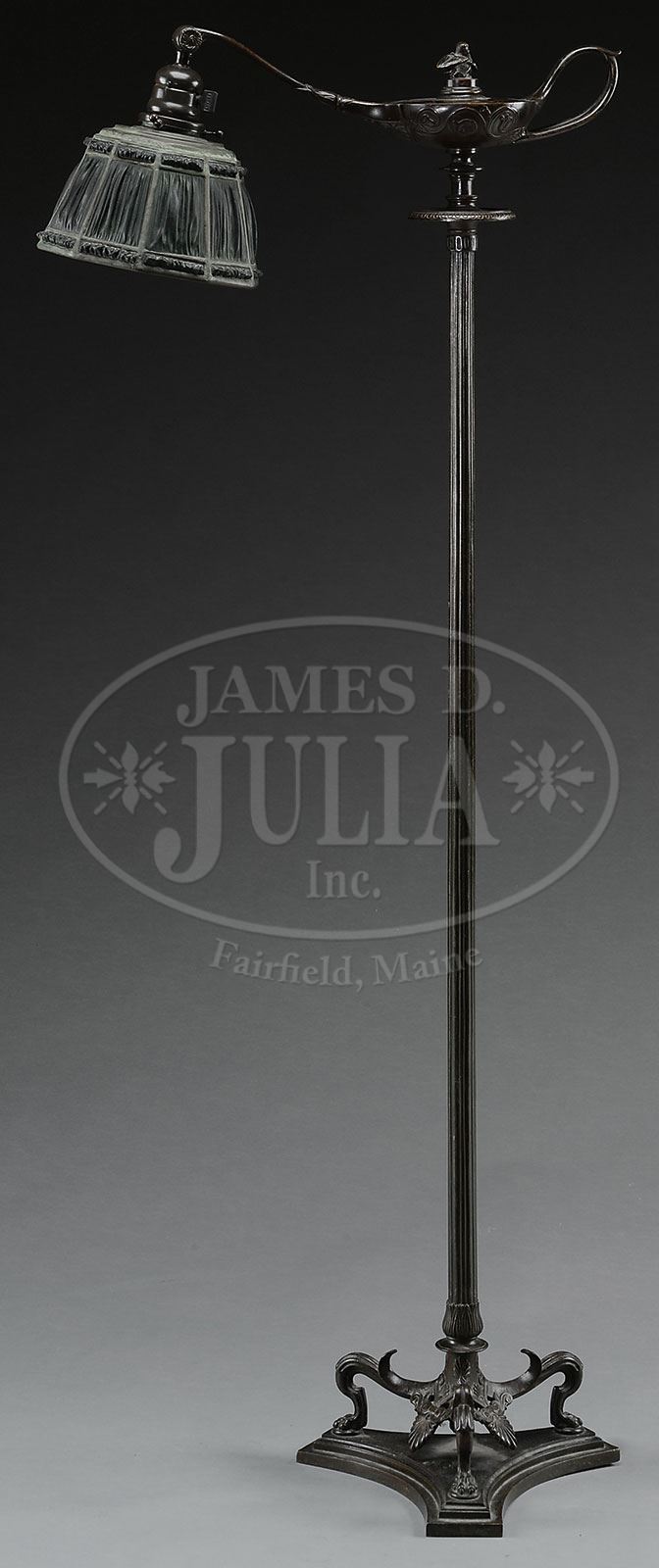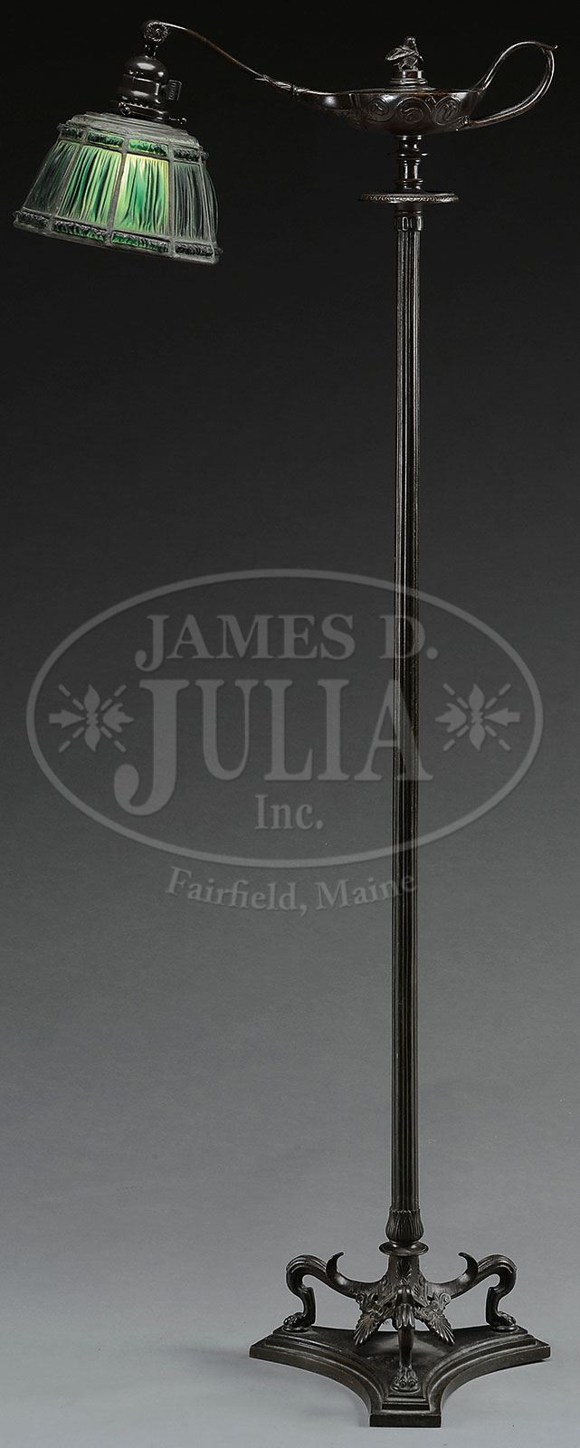TIFFANY STUDIOS LINENFOLD FLOOR LAMP.Tiffany Studios floor lamp has linenfold shade has 10 emerald green drapery glass panels with border panels at top & bottom. Shade is signed “Tiffany Studios New York Pat. Appl’d For 1938”. Shade is supported by a Tiffany Studios adjustable Aladdin floor lamp base with dark brown patina. Base is unsigned. SIZE: Shade: 7-3/4″ dia. Lamp: 54″ t. CONDITION: Very good to excellent with some minor wear to patina on base. Base is missing knob for tightening adjustable height. 5-69182 (15,000-20,000) – Lot 3062