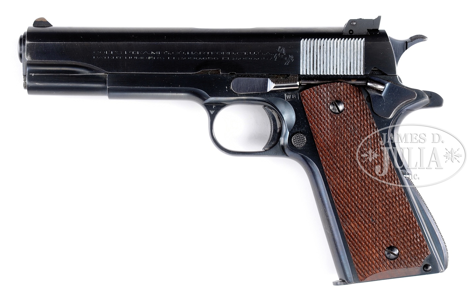 *SUPERB U.S. MILITARY INSPECTED (WB) COLT SERVICE MODEL ACE SEMI·AUTOMATIC PISTOL. SN SM2582. Cal. 22LR. 5″ round bbl. All matching (SN under firing pin stop plate, “2582”). Blue finish, full checkered walnut stocks. Manufactured in 1941. Fixed front and adjustable rear sights. Checkered trigger, magazine release, thumb safety, slide release, hammer spur, and arched main spring housing. The left side of the slide is marked with the Hartford address and the patent information in 2-lines followed by the “RAMPANT COLT”. The right side is marked “COLT’; “SERVICE” over “MODEL” ;’ACE” in a diamond, “.22” “LONG” over “RIFLE”. The SN (SM 2582) is on the right side of the frame, the right front trigger guard bow is marked “60”. The left trigger guard bow is marked “P” over the Colt “VP”. Checkered stocks and like new two-tone blued magazine marked “COLT” over “